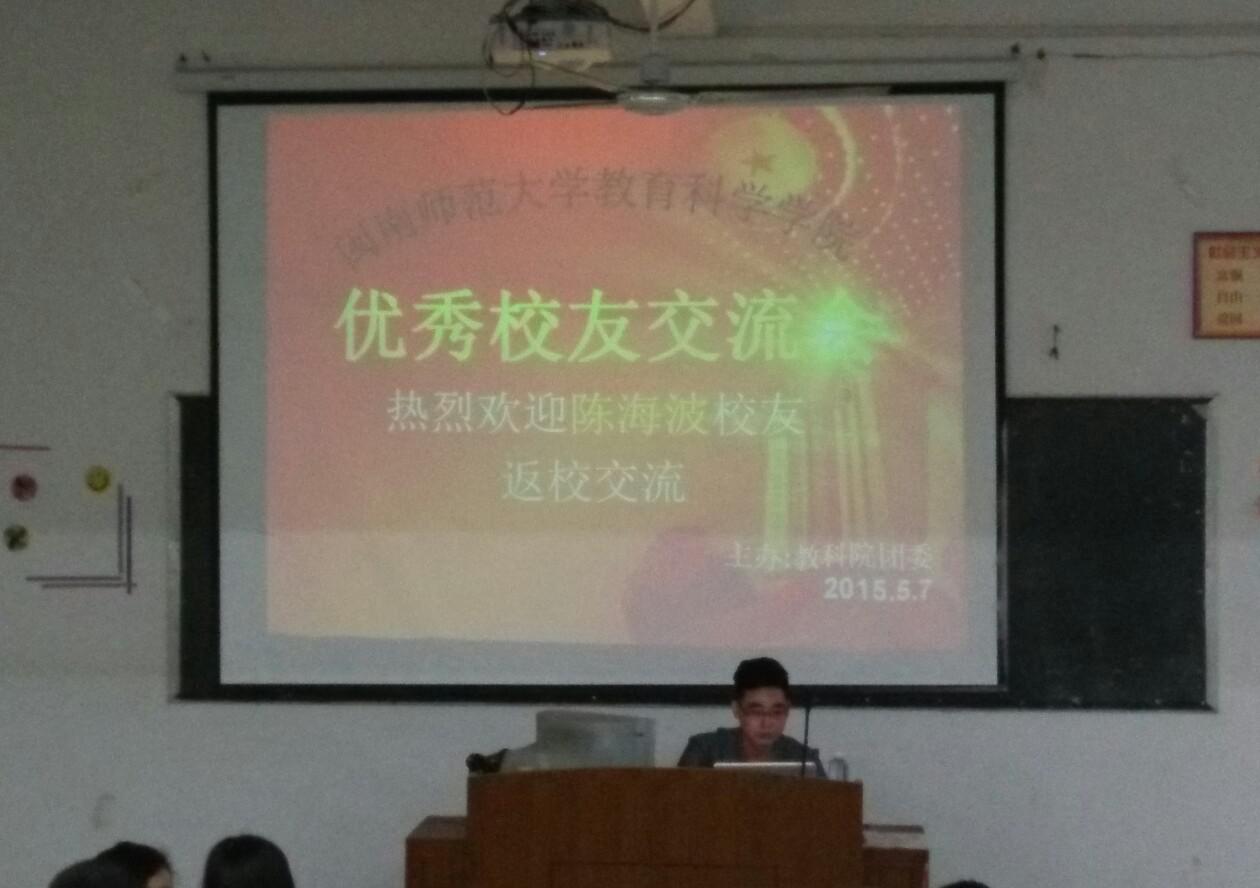 5月5日下午,教育科学学院优秀校友交流会在梯教一顺利召开,此次交流会邀请到2002级小学教育专业的校友陈海波返校交流。