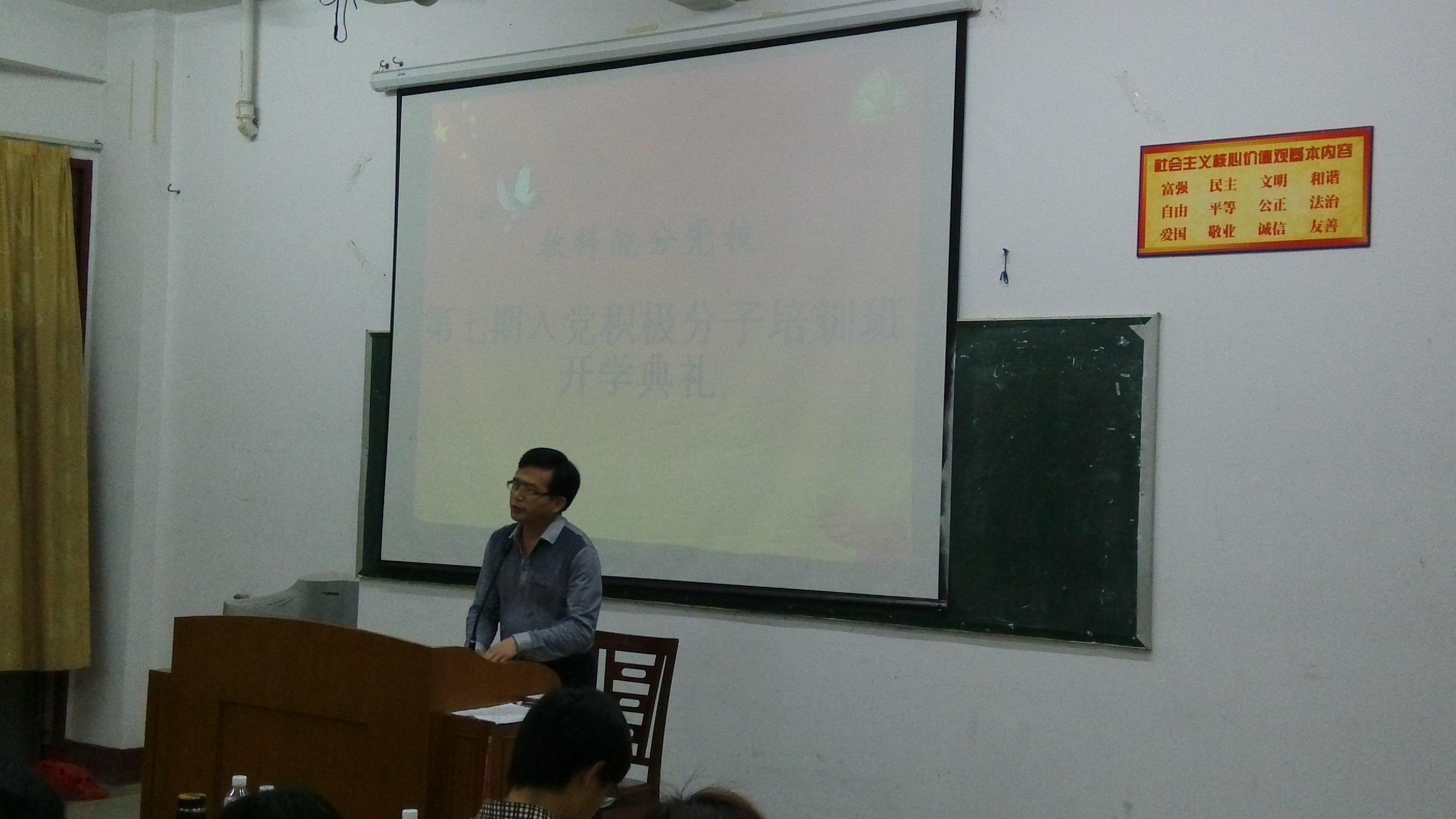 2015年4月1日晚七点在梯教一举行了教科院分党校第七期积极分子培训班的开学典礼,院党委书记朱志明教授、党务秘书辛如彬老师、研究生辅导员鲍超老师和13级辅导员崔文菊老师参加了本次的开学典礼。