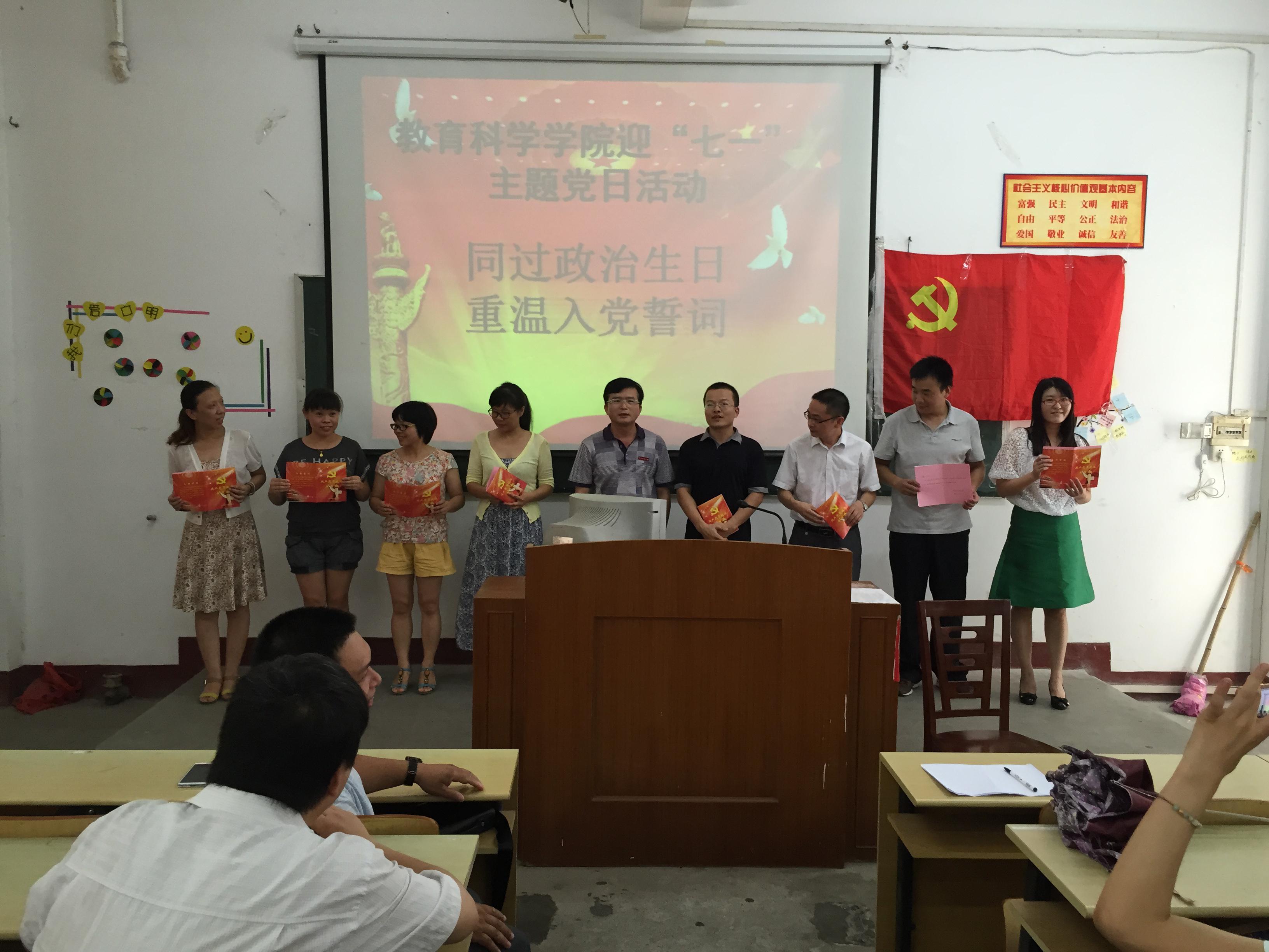 7月1日下午教育科学学院开展了“同过政治生日,重温入党誓词”迎“七一”主题日活动,教工党员和新学生党员团聚一堂,共同庆祝中国共产党建党94周年纪念。
