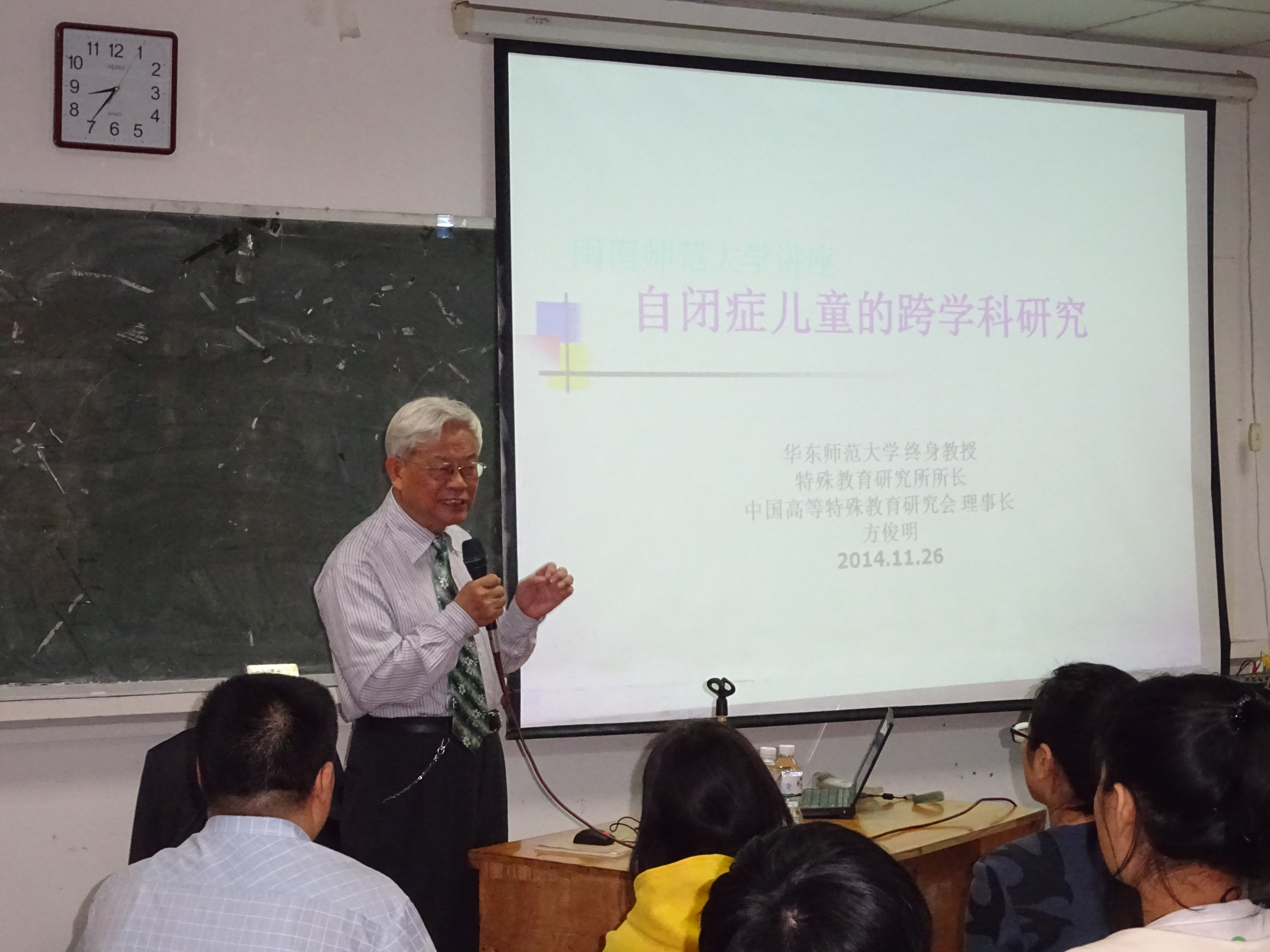 应我校教育科学学院、学校“自闭症诊治与教育”创新团队邀请,中国高等教育学会特殊教育研究会理事长、华东师范大学终身教授、博士生导师方俊明先生莅临我校,于11月26日上午为心理学、学前教育专业等专业的研究生、...