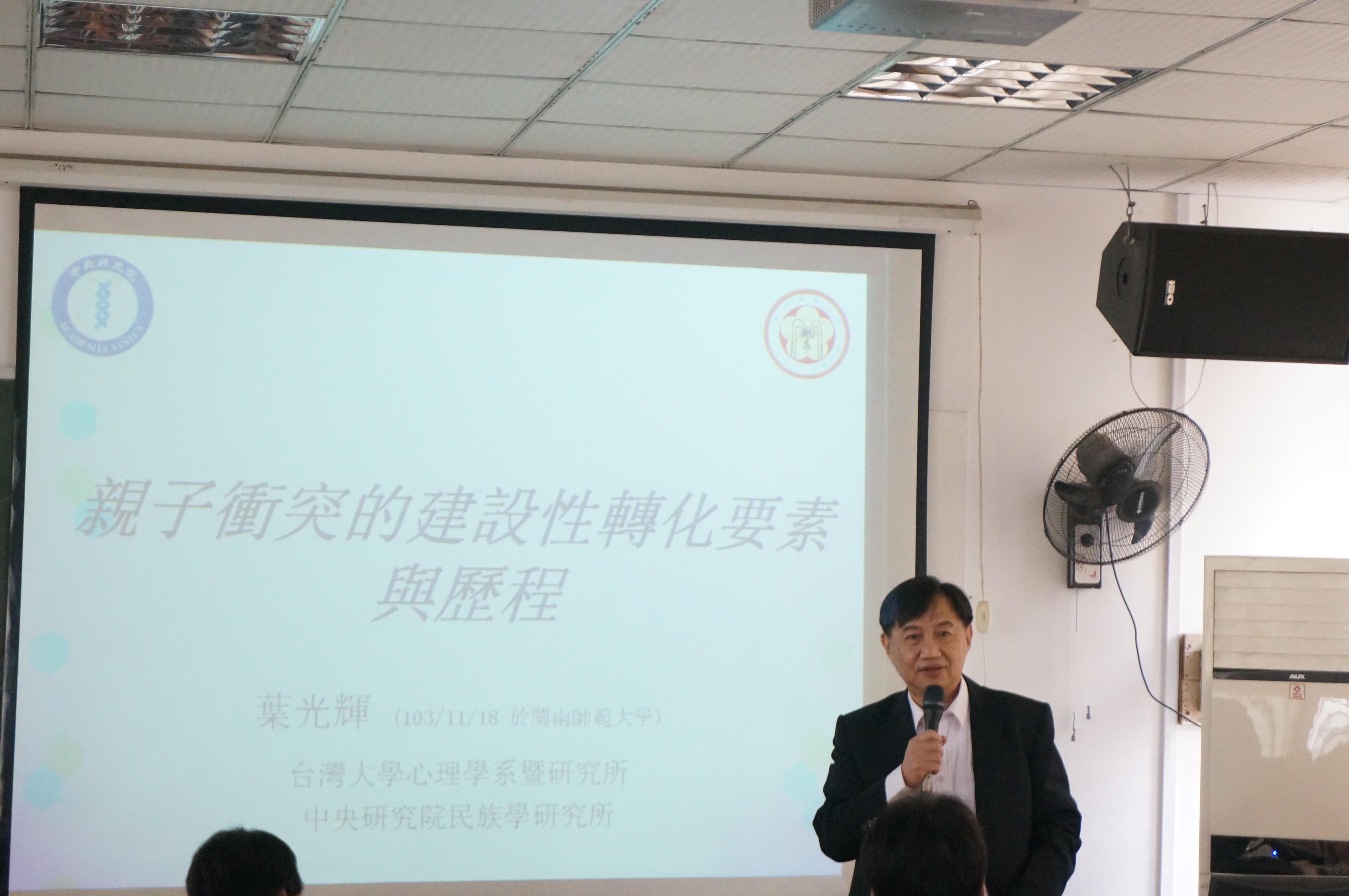 2014年11月18日,台湾大学心理系暨研究所、中央研究院民族学研究所叶光辉教授应邀来我校教育科学学院讲学,此次学术讲座在创业楼418教室举行,由教育科学学院院长、硕士生导师张灵聪教授主持。