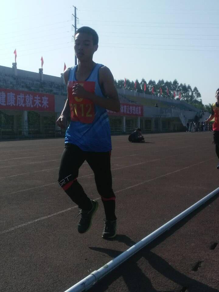 比赛还未开始,他便锻炼热身,使自己进入最好的状态。发令枪一响,他的起跑更是如同离弦之箭般地。3000米可不是省力的,需要调整呼吸,保持节奏,把握时机冲刺。但是他在整个过程一直保持在前三的位置,并把该优势保持住而且最后阶段奋力冲刺,因此取得了小组第1名的成绩。