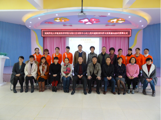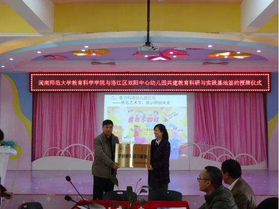 2016年1月11日上午,yl23411永利教育教育科学学院黄清院长带领学前教育系专业教师及项目合作幼儿园园长一行8人到泉州洛江区双阳中心幼儿园举行了教育科研实践基地签约授牌仪式。洛江区教育局党组书记、曾志宏局长及幼教股、人事股负责人员、双阳中幼儿园园长和骨干教师代表参与了授牌仪式。泉州洛江区是我校师范生培养创新实验区之一,前几年都是与该区中小学合作,今年把创新实验区的工作拓展到幼儿园。双阳中心幼儿园是我校在洛江区建立的首个教育科研实践基地。该园创办于1960年,2006年3月被评为泉州市优质幼儿园,2010年12月被评为泉州市示范性幼儿园。双方共同商议了实践基地建设的思路与措施,并就师范生的实践能力培养和幼儿园教师的科研与培训工作的合作进行了初步的规划,双方表达了长期合作的愿望,以期实现高校和幼儿园的资源共享、互利共赢、共同发展。目前我校学前教育专业在漳州、厦门、泉州等地都已建立实践基地,为提高师范的实践能力提供了重要保障。