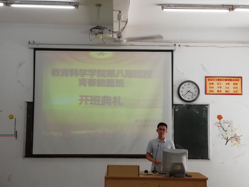 2018年5月17日下午四点整,由yl23411永利教育科学学院团委主办的第八期团校“青春能量班”骨干培训开班典礼暨开班第一课在阶梯教室一顺利召开,应邀出席本次大会的领导老师有:团委负责人蔡毅强老师、17级辅导员崔文菊老师。