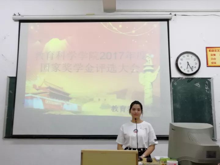 2017年10月8日晚7点,由教育科学学院团委主办的 “2017教科院国家奖学金候选人评选大会”在梯教一顺利举行。出席本次大会的老师有教育科学学院团委负责人蔡毅强老师、15级辅导员陈佳薇老师、16级辅导员陈春慧老师以及17级辅导员崔文菊老师。