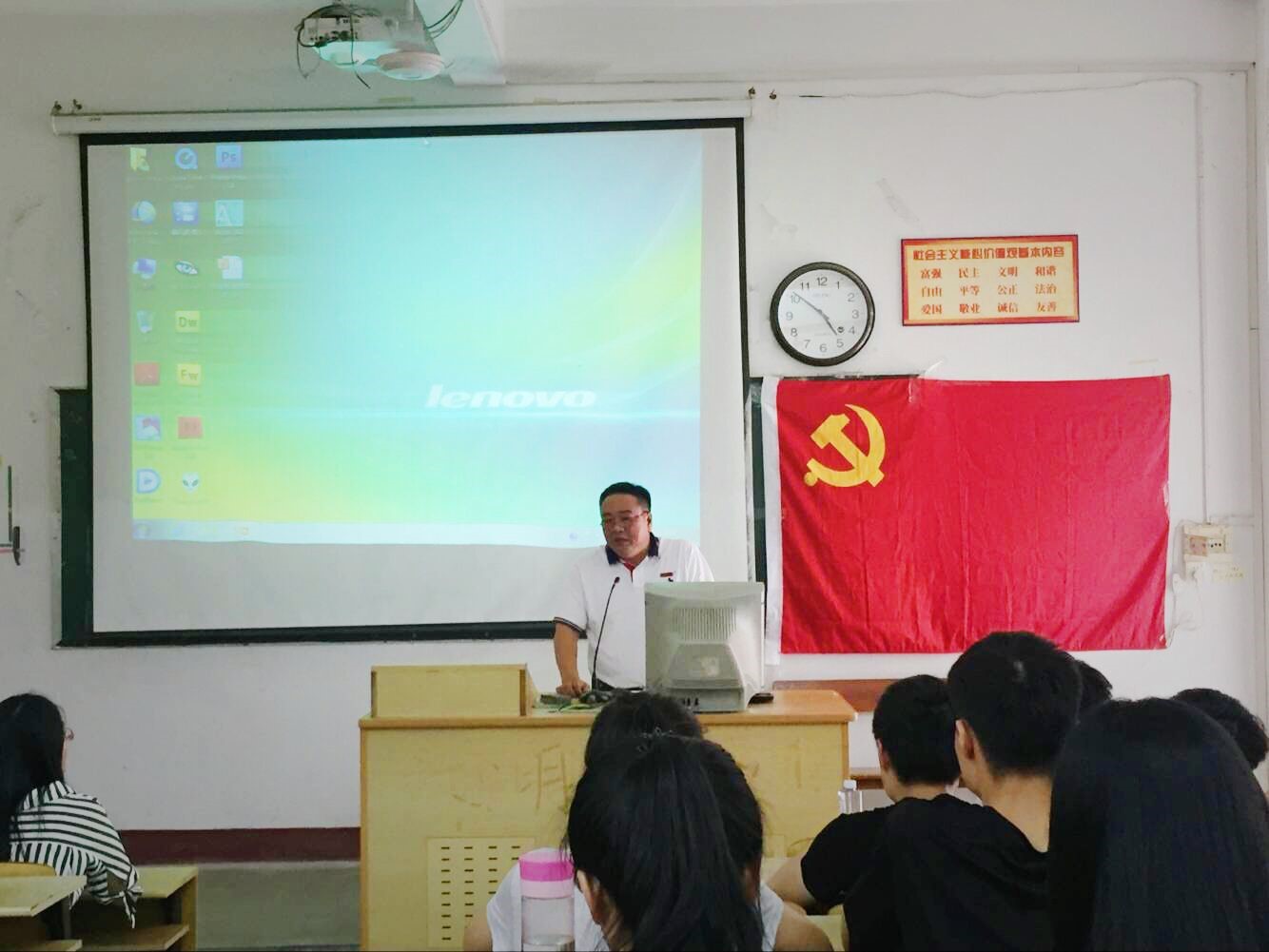 2018年5月24日下午4点整,在梯教一举行了毕业班党员离校教育活动。我们很荣幸邀请到了教科院党委书记郑文海教授、研究生辅导员兼党务秘书鲍超老师、14级辅导员陈钰煌老师来参加此次活动。