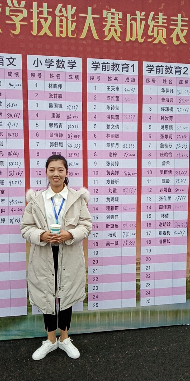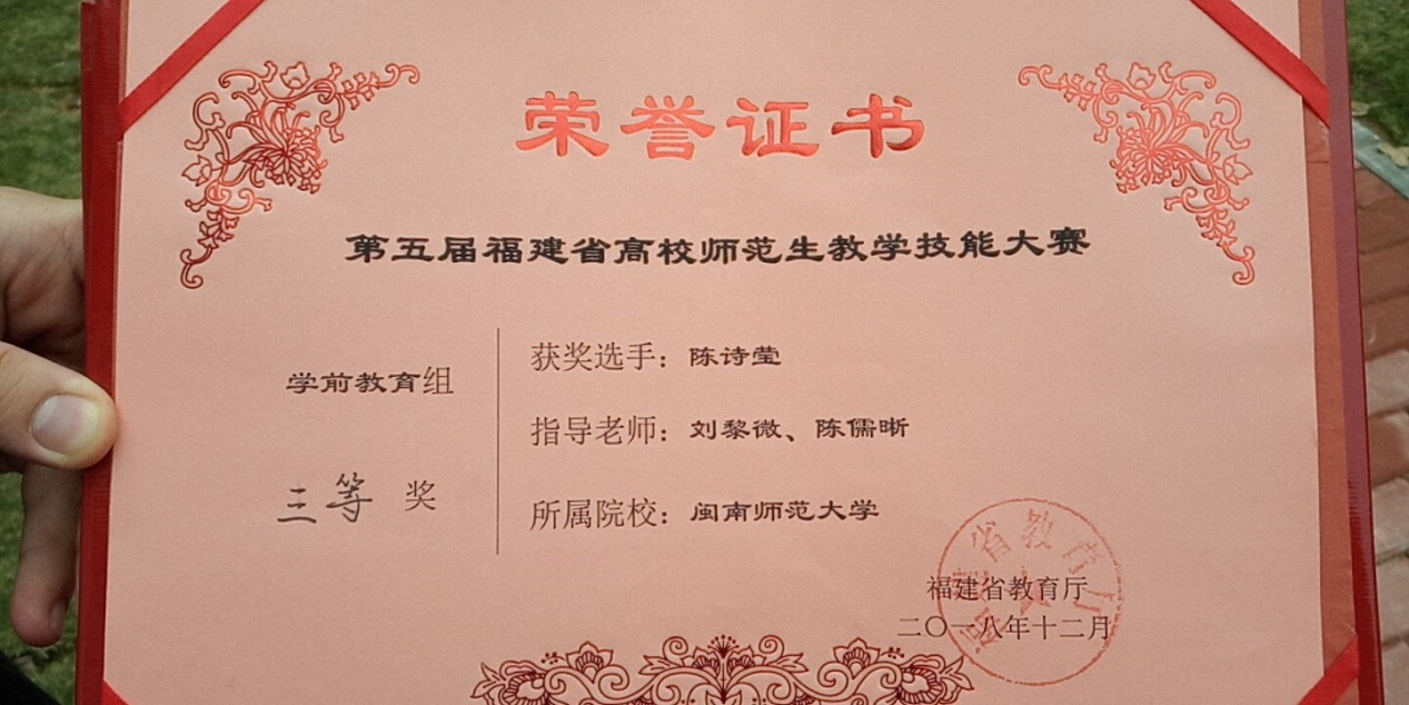 陈诗莹同学在学期间积极参与校内外竞赛,且在国赛竞比中获得优秀成绩。此次代表本院学前教育专业出赛,在众多优秀省内选手群里,勇获三等奖,殊属不易。陈同学表示感谢指导老师与校内师长的教导,让自己对教学设计展现专业特性,且在教姿教态方面亦比同侪更有自信。虽然得到三等奖,自己深感还有许多努力成长空间,期许未来能在教学创新与师幼互动之专业表现能有所发挥,亦期待学弟妹能从此次比赛经验里学习成长,日后代表本院参加省赛能取得更优异成绩。