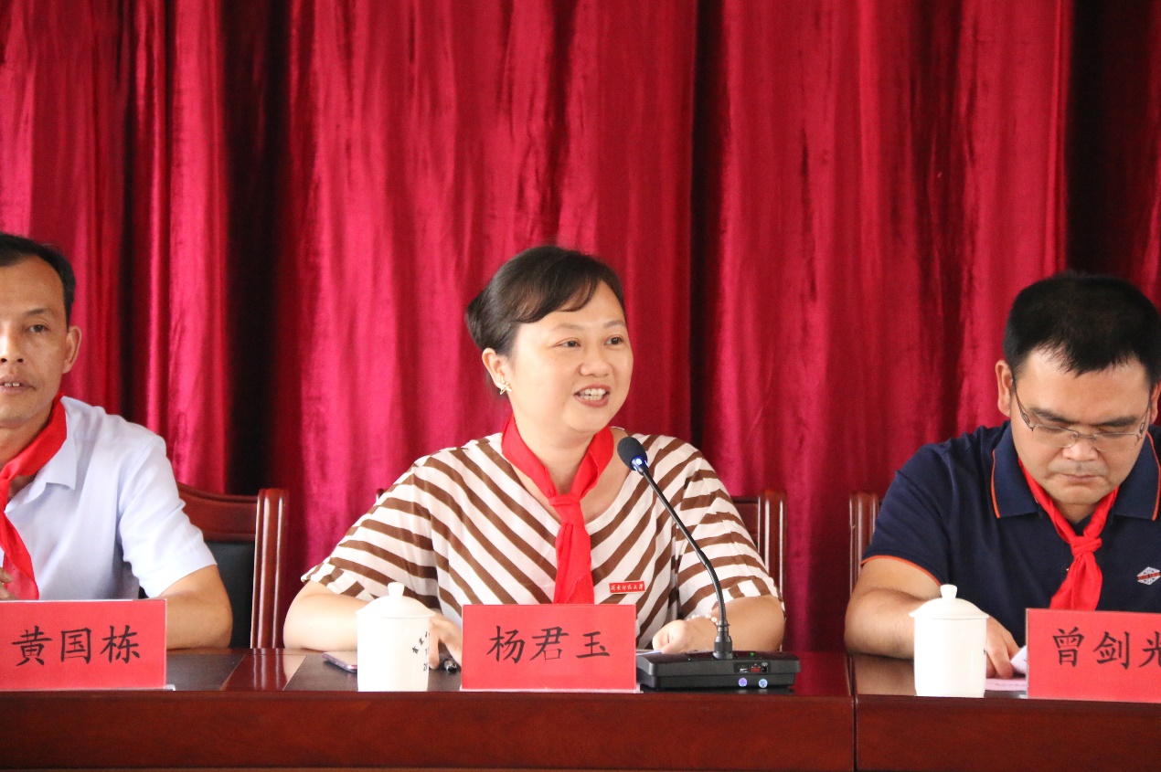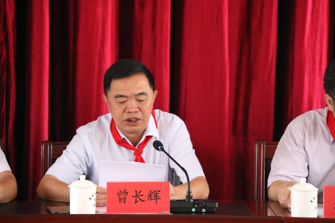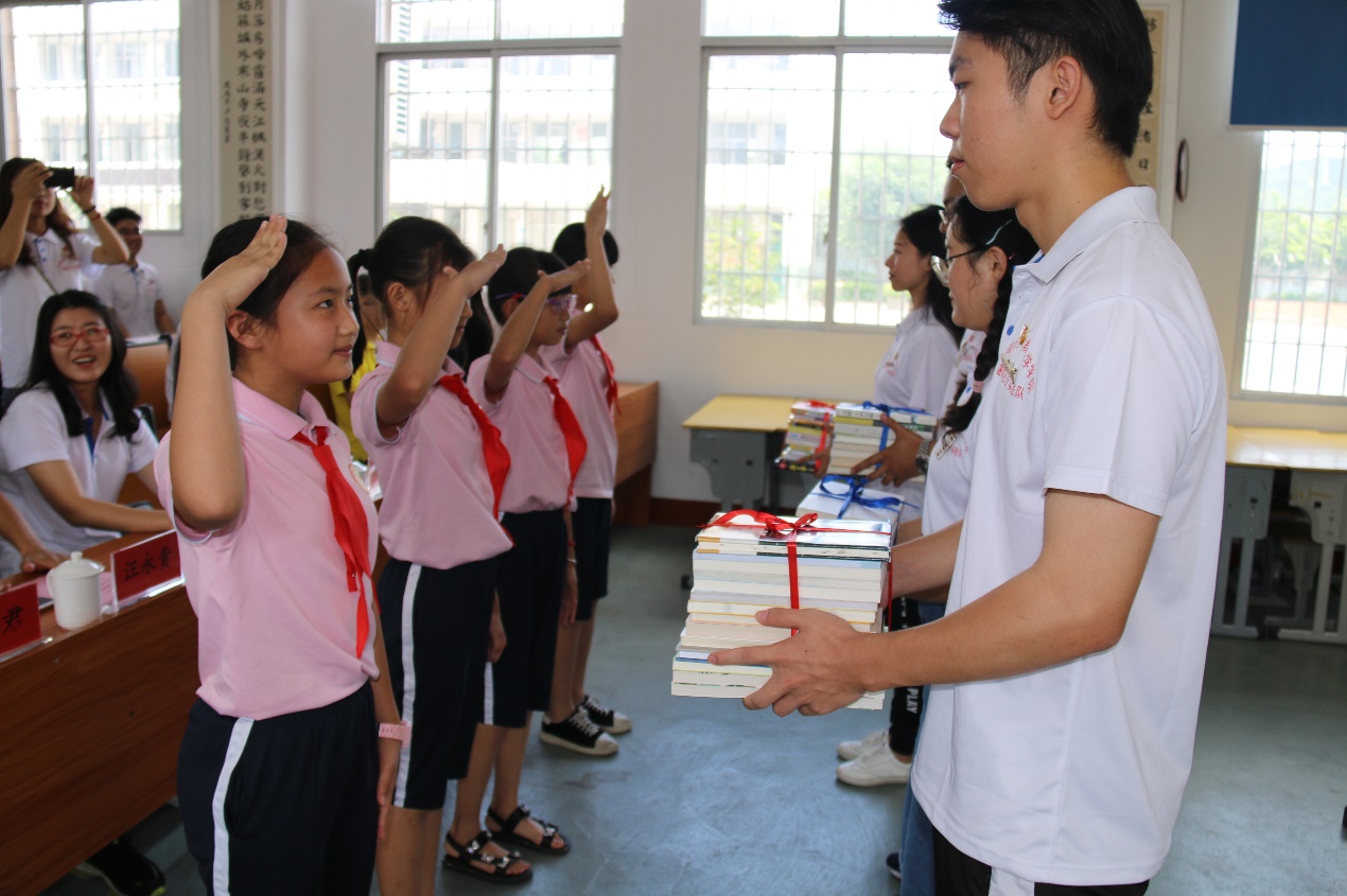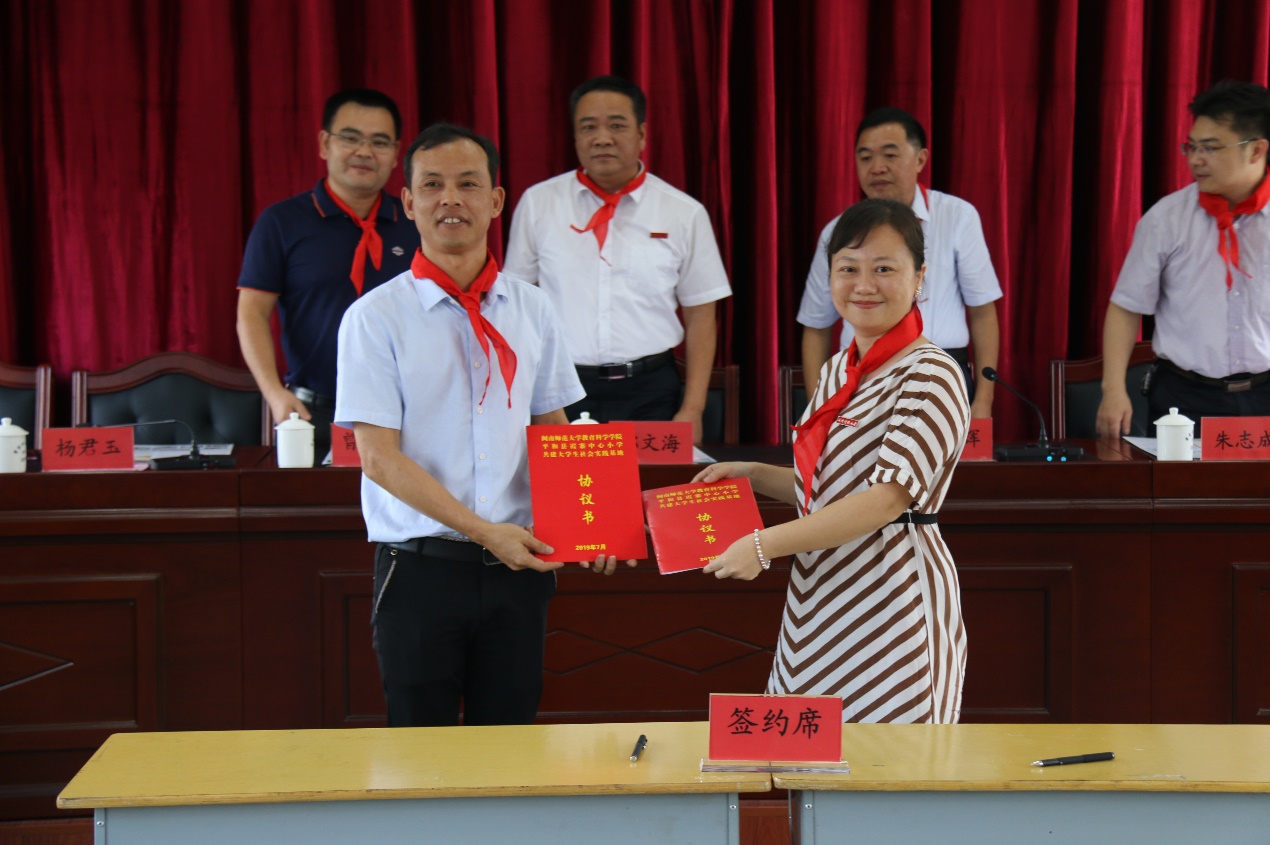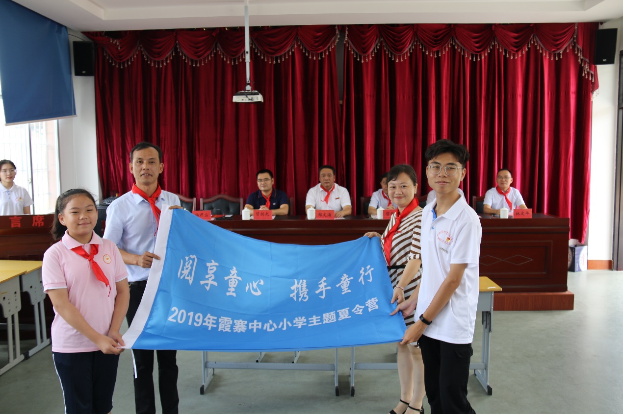 仪式上,首先是少先队员向来宾敬献红领巾。随后,平和县人民政府教育督导室曾长辉副主任发表讲话,他向服务队的到来表示热烈的欢迎和深切的问候,向在座的各位介绍了平和县中小学教育的发展情况,同时也对同学们提出了三点希望:热爱伟大祖国,树立伟大理想;坚持砥砺奋斗,担当时代重任;练就过硬本领,锻炼品德修养。要充分发扬“奉献、友爱、互助、进步”的志愿者精神,服务基层,服务群众。并希望通过此次社会实践活动基地的建立,更好地助力乡村教育振兴战略发展。教科院党委副书记杨君玉老师发表讲话,讲话中首先介绍了我院的发展概况,充分肯定了霞寨中心小学办学以来取得的优异成绩,并希望同学们在实践中,要吃苦耐劳,认真观察,用心体验,热情服务,以专业指导实践,用实践夯实专业,努力为霞寨中心小学带去最优质的志愿服务。她指出,此次签约共建活动,不仅是我院与平和霞寨中心小学加强交流合作的一种新形式,更是在校地共建乡村小学青少年宫的大背景下,积极构建校地有机结合育人新模式、协力做好人才培养的一次有益尝试,希望双方今后可以在更多领域、更大范围内开展深度合作,积极为服务乡村教育振兴发展做出更大的贡献。接着,杨副书记代表教科院与霞寨中心小学校长签订协议,我院郑文海书记为霞寨中心小学授牌,并向霞寨中心小学捐赠了300本图书。最后在夏令营开营仪式中,我院杨副书记和霞寨中心小学黄国栋校长为2019“阅享童心,携手童行”夏令营进行授旗,实践队队长康溢煌和夏令营营员代表上台接旗。