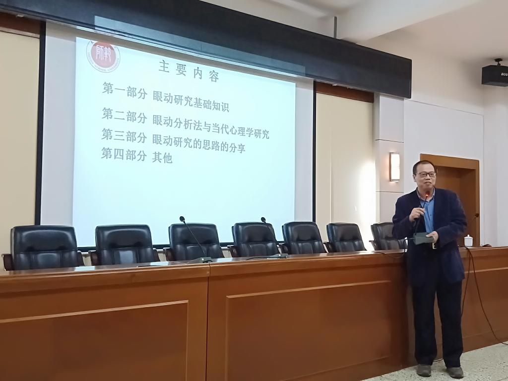 第二场讲座是闫国利教授的“中文阅读知觉广度的眼动研究”。闫教授在本次的主题讲座中主要从眼动研究基础知识、眼动分析法与当代心理学研究、眼动研究的思路分享这几个方面进行报告。闫教授认为在眼动研究中,最主要的指标为注视和眼跳,并通过文献资料指出当前在眼动研究中的主要眼动指标和眼动研究范式。闫教授强调眼动研究在当代心理学的研究中有广泛的应用。特别是在阅读研究方面,闫教授通过“一目十行”这一成语引出“阅读知觉广度”这一研究主题,并报告了不同被试特点、材料特点、阅读任务、阅读场合、研究范式等方面都可以做更多深入研究。除了在阅读方面,眼动研究还在数学、广告、运动、音乐等方面都可以有所贡献。闫老师根据这些年的眼动研究的经验,教导学生们积极主动地抓住一个兴趣点或创新点,并深入钻研开展系统的研究,才能够学有所成。