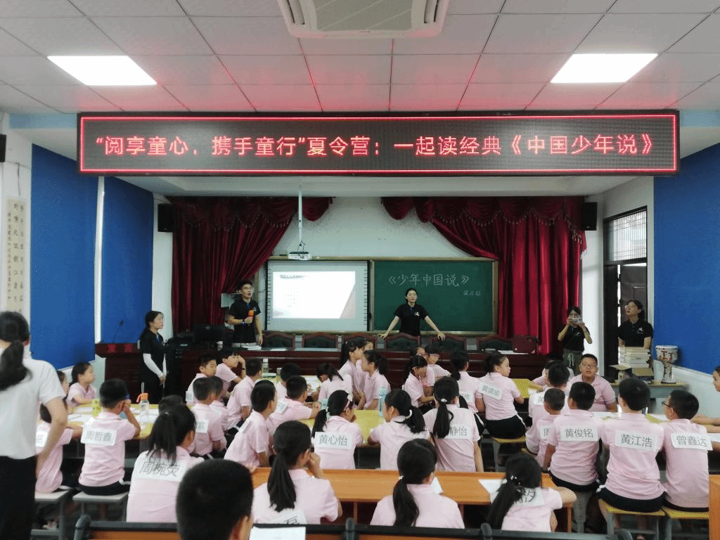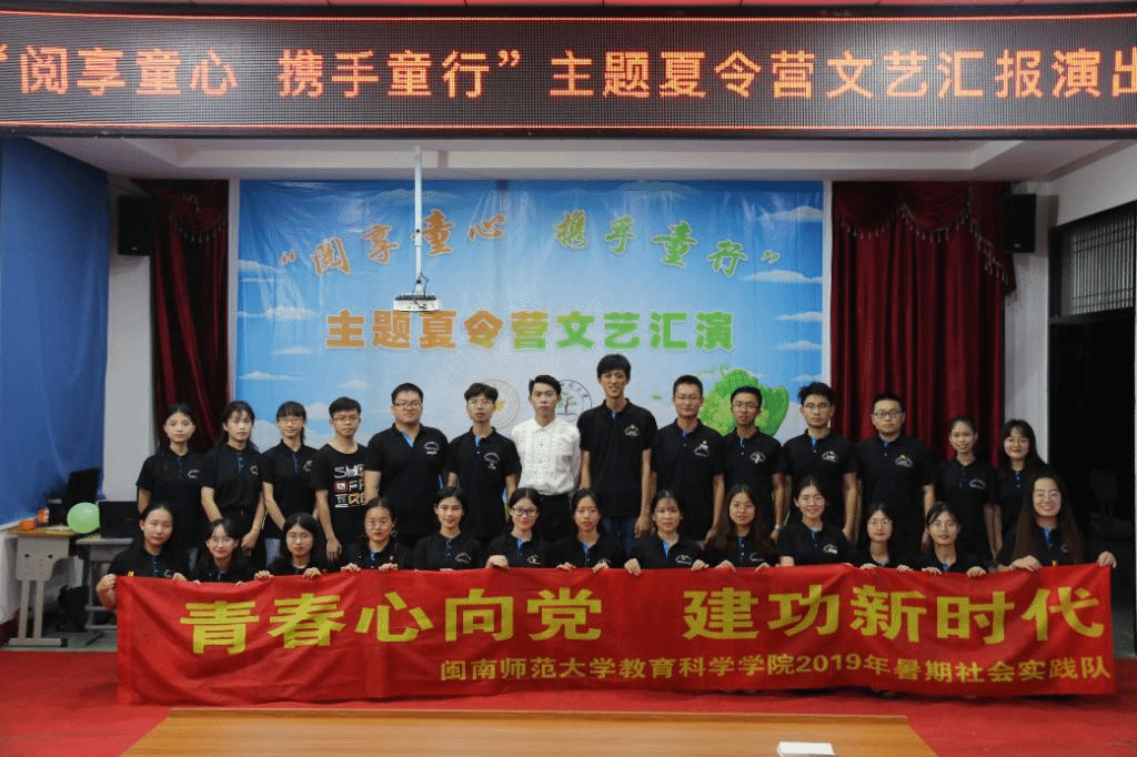 活动中,此次服务团成员充分发挥学科优势、专业特色,针对平和县霞寨中心小学四五年级的优秀学生,围绕提升他们的阅读水平和和养成良好阅读习等内容,开展课本剧排练、经典诵读、知识竞赛、名著鉴赏、兴趣小组等形式多样的夏令营活动。服务团成员严格按照课程安排进行活动组织与管理,活动有条不紊地进行下去。课本剧排练不仅提高了学生们的语文阅读能力和理解能力,也锻炼了他们的表演力和语言表达能力,此外,老师还根据学生的生理和心理特征,开展了以动画为形式的名著鉴赏,并采用寓教于乐的方式进行经典诵读,帮助学生从多角度、多方面欣赏经典书籍,培养学生良好的阅读习惯和兴趣,阿卡贝拉、非洲鼓、吉他、手工课等兴趣小组,既拓宽了学生的视野,也丰富学生们的第二课堂。此外,此次教育关爱服务团于7月11日举行了“阅享童心,携手童行”夏令营文艺汇演,本次文艺演出内容丰富,形式多样。歌曲、舞蹈、相声、琵琶等节目贴近学生生活。整个汇演在和谐、温馨、快乐的氛围中圆满落幕。