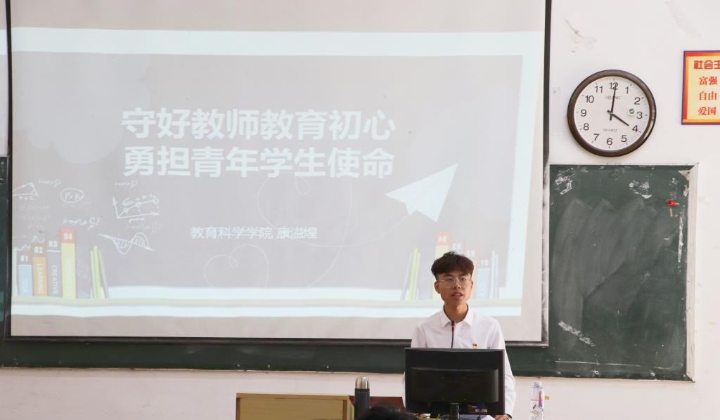 康溢煌同学表示很荣幸能够成为公费师范生代表去参加表彰大会。他以何为立德树人、什么是教育初心为出发点,希望作为教育工作者的各位要做到立德树人,不忘初心。同时他也希望大家能够牢记习近平总书记的嘱托,为党育人、为国育才;以德施教、立德树人;刻苦钻研、教学相长;尊重宽容、严爱相济,做党和人民满意的“四有”好老师。并倡议同学们要做以德立身的楷模,严于律己,以高尚的道德情操展现教师人格的魅力;自觉担起做好人民群众向往的教育的责任与使命;坚守好做为教师的初心。
