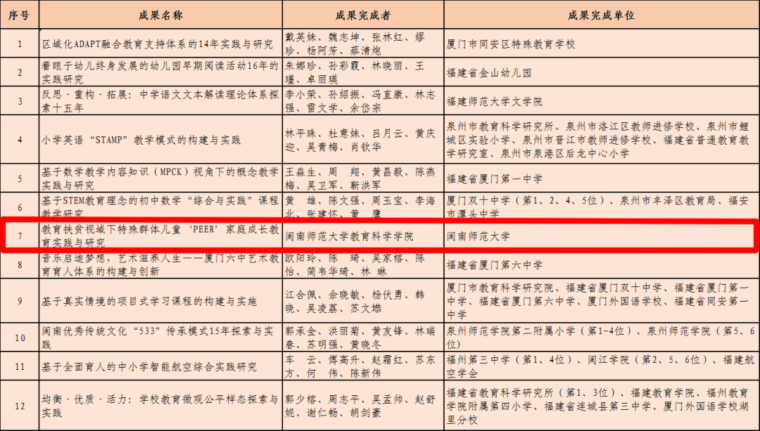 近日,福建省教育厅公布2020年省级基础教育教学成果奖获奖项目名单,我院“教育扶贫视域下特殊群体儿童‘PEER’家庭成长教育实践与研究”项目荣获特等奖。