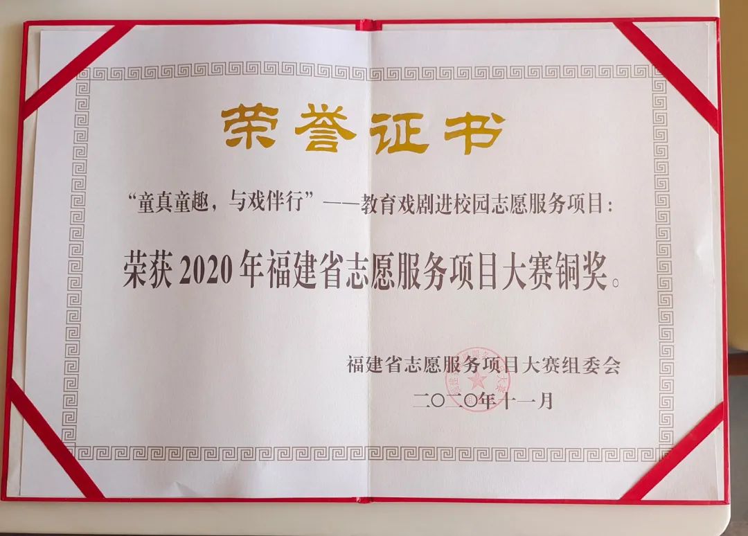 ▲“童真童趣,与戏伴行”——教育戏剧进校园志愿服务项目荣获2020年福建省志愿服务项目大赛铜奖