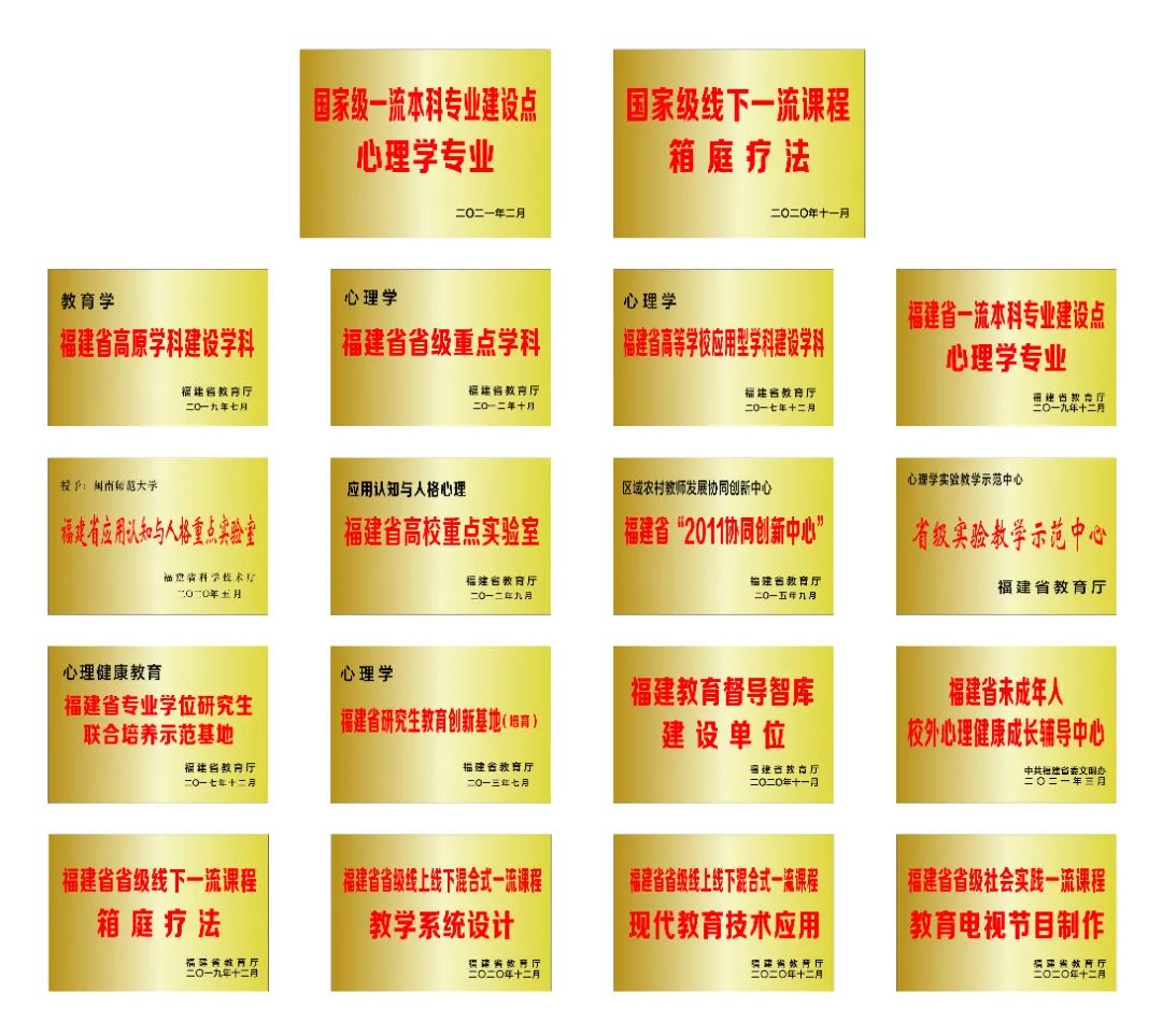 学院在福建省级实验教学示范中心(心理学实验教学示范中心)基础上,十年来,获批了福建省高校重点实验室、福建省应用认知与人格重点实验室,福建省心理健康教育专业学位研究生联合培养示范基地,福建省研究生教育创新基地(应用心理学),福建省“2011”协同创新中心(区域农村教师发展协同创新中心),福建教育督导智库项目建设单位,福建省未成年人心理健康成长指导中心,搭建了学科专业广阔的实践实验平台,建立了50多个稳定的校外见习、实训、实习基地,能满足研究生、本科生实践教学需要。
