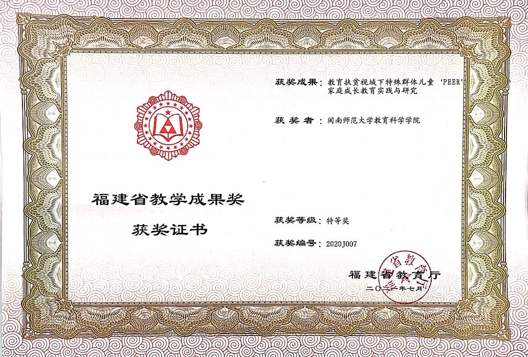 ▲《教育扶贫视域下特殊群体儿童“PEER”家庭成长教育实践与研究》荣获福建省教学成果特等奖