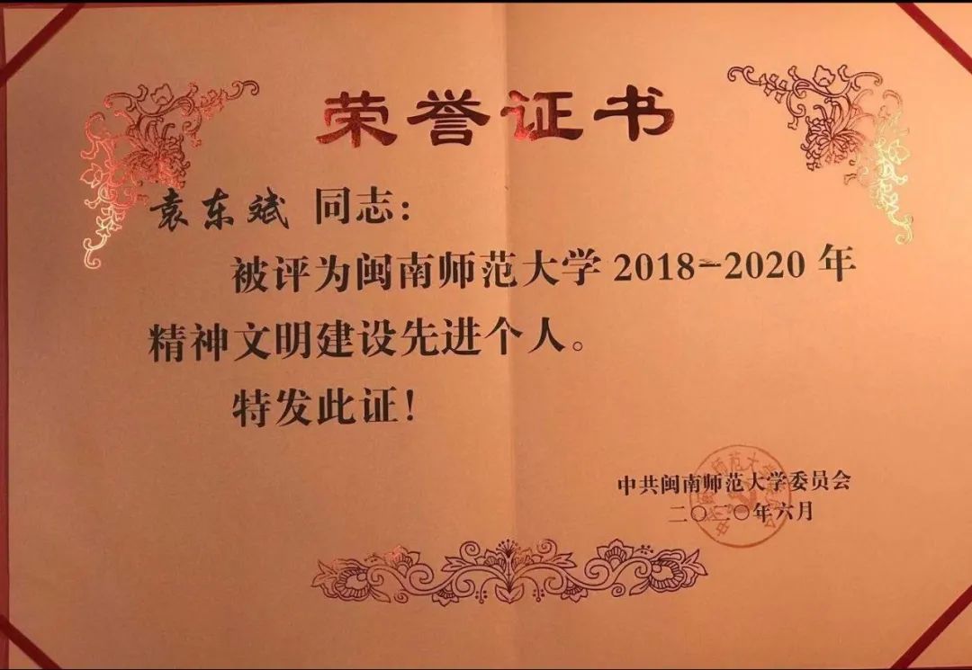 作为专任教师,袁东斌老师教学态度认真,治学严谨,学识扎实,坚守教育教学一线,高质量地完成教育教学工作任务,努力推进教育创新。其所授课程受到了师生的一致好评,学生每年评教分数均在90分以上。袁老师把教书育人作为教师的根本任务,不断地对教学进行创新,提高自身的教学水平,充分发挥专业特长,利用各种信息技术手段,进行教学改革。2020年,袁老师获校“优秀教师”荣誉称号。
