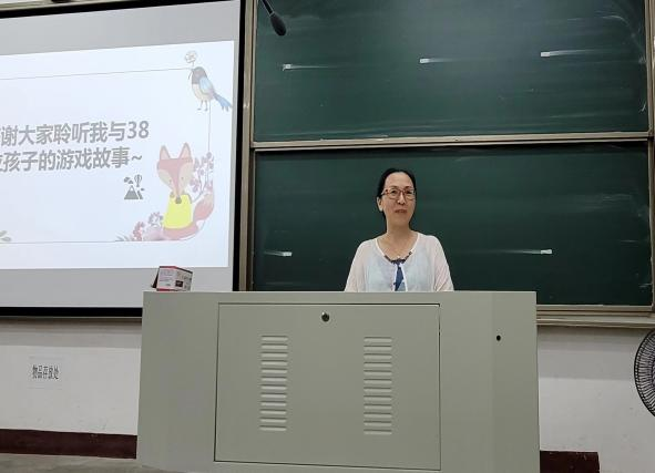 在实习总结大会上,游戏案例一等奖获得者詹水英同学就活动源起和前期经验、环境创设和游戏材料、游戏推进过程、活动特点及价值所在等方面讲述了游戏故事“我心目中的小学”,她强调要通过灵活且有创意的方式捕捉和生成幼儿游戏的生长点,把儿童游戏中出现的丰富多彩的不确定性转化为发展现实。