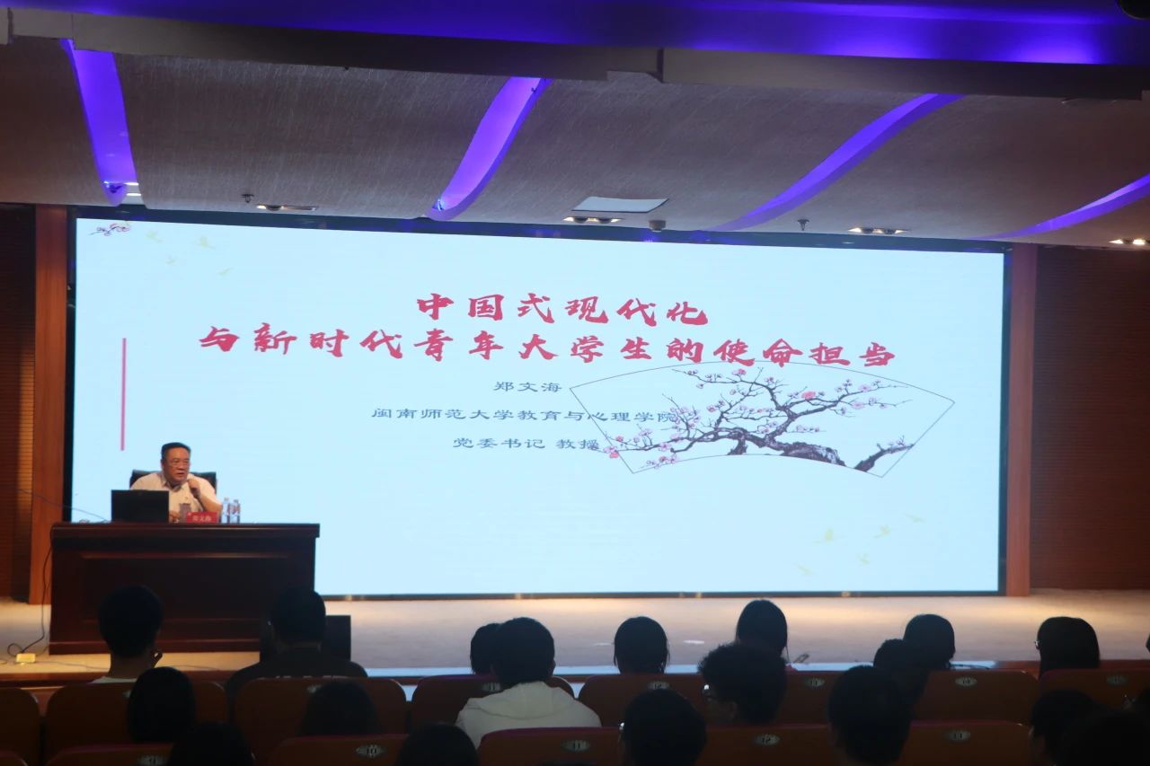 郑文海书记以《中国式现代化与新时代青年大学生的使命担当》为题给2023级新生们上第一堂党课 。郑书记结合时政热点与生动实例,从什么是中国式现代化、为什么要走中国式现代化道路、如何走好中国式现代化道路、中国式现代化会为世界发展带来什么、中国式现代化新征程上新时代青年大学生的使命担当五个方面对中国式现代化进行深入解读。深刻易懂、引经据典的发言引得全场喝彩频频,掌声不断,同学们纷纷表示要在学思践悟中铸牢思想之魂,做红色基因的传承者。