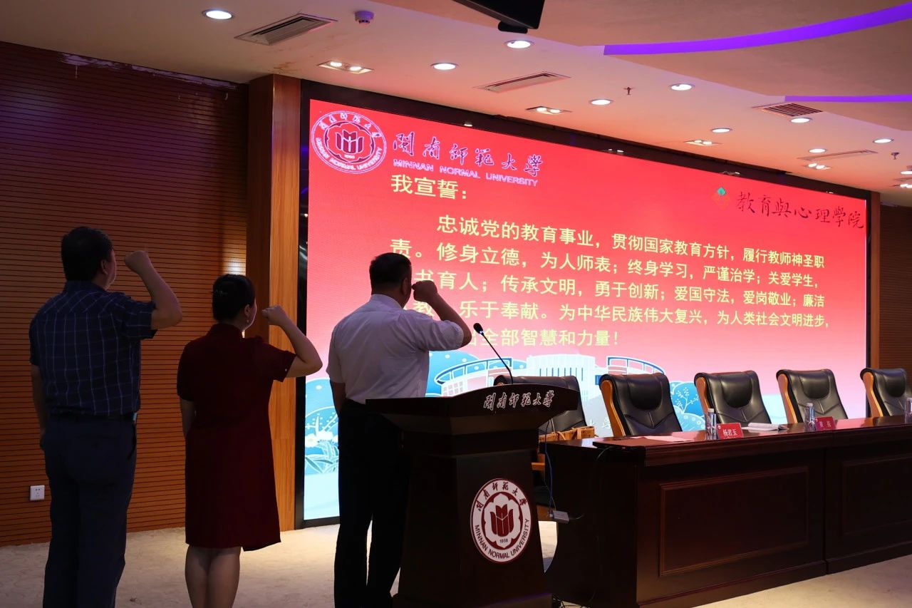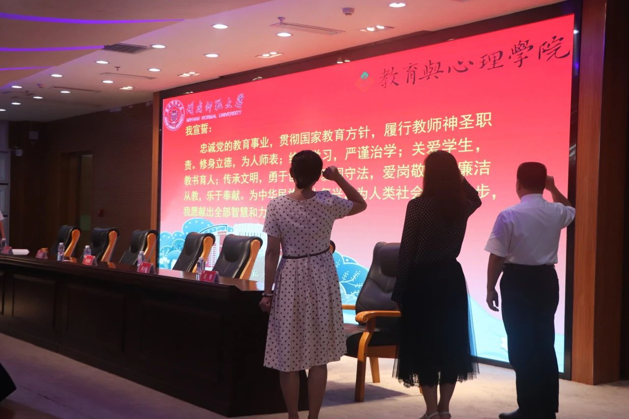 全体师生在院党委书记郑文海教授带领下进行教师宣誓。四年教心人,一世赤子心。昂扬整齐的宣誓声,是教心院学子从此忠于教育,献身教育的决心和信念,是努力成长为辛勤“园丁”的青春誓言。