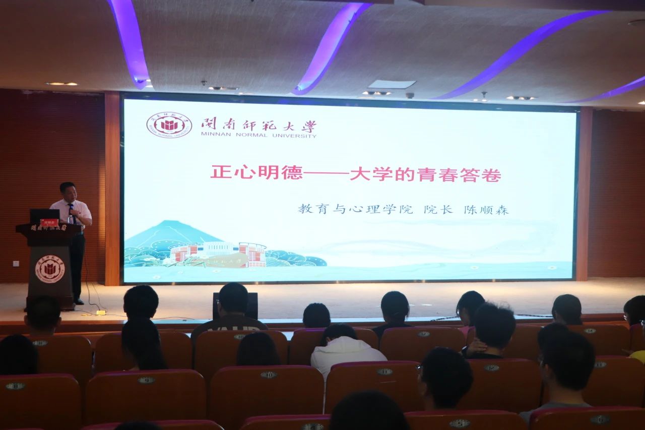 院长陈顺森教授以《正心明德——大学的青春答卷》为题,向新生讲述了学院的历史沿革及院训由来,用自己丰富的人生阅历和诙谐有趣的语言艺术,从人生发展、自我提升、社会认知、家庭关系处理、未来规划等方面为新生们开展了精彩的“院长第一课”,引导新生尽快摆正入学心态,铆足干劲,从“心”出发,逐梦远航。