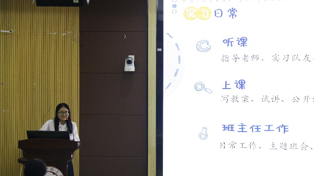 分队汇报结束后,王霖杰、饶春燕两位同学分享实习故事。他们通过鲜明生动、有血有肉的实习故事,从教学、课堂组织和班级日常管理等多方面分享了自己在实习前后的心态变化,以及在实践中所收获的经验与感悟,为新学期即将开展实习的同学提供了参照。