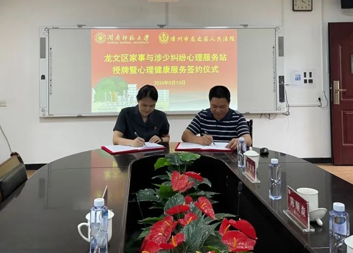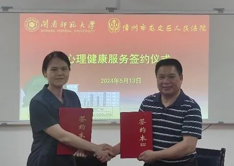 为通过提供专业的心理健康服务,提升司法公正与人文关怀,让法治更有温度、更有力量,2024年5月13日,yl23411永利集团同漳州市龙文区人民法院举行“龙文区家事与涉少纠纷心理服务站”签约授牌仪式。根据协议,双方将围绕家庭事务与涉少纠纷案件开展心理咨询与辅导、心理健康培训、心理科普服务等活动。我院院长陈顺森、龙文区人民法院审判委员会专职委员陈婧怡代表双方签约授牌。