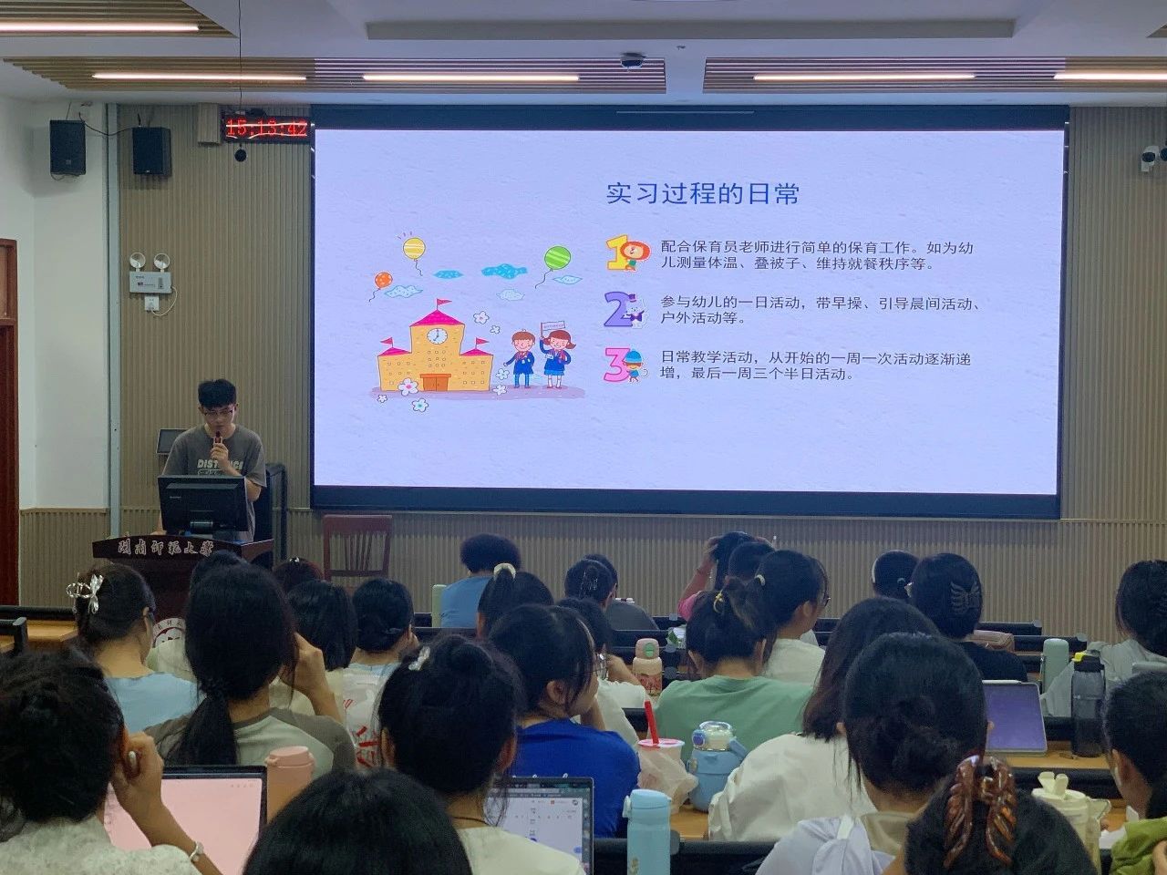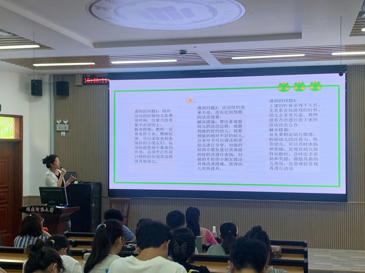 为深入总结教育实践工作,分享实习经验,展现我院学前教育专业学子实习风采,9月26日下午我院学前教育系在梯教一开展了2021级学前教育专业实习总结汇报会。副院长黄亮副教授、学前教育系主任杨爱君老师和全系教师以及2021级、2022级学前教育专业同学参与本次会议,会议由学前教育系副主任林翎老师主持。