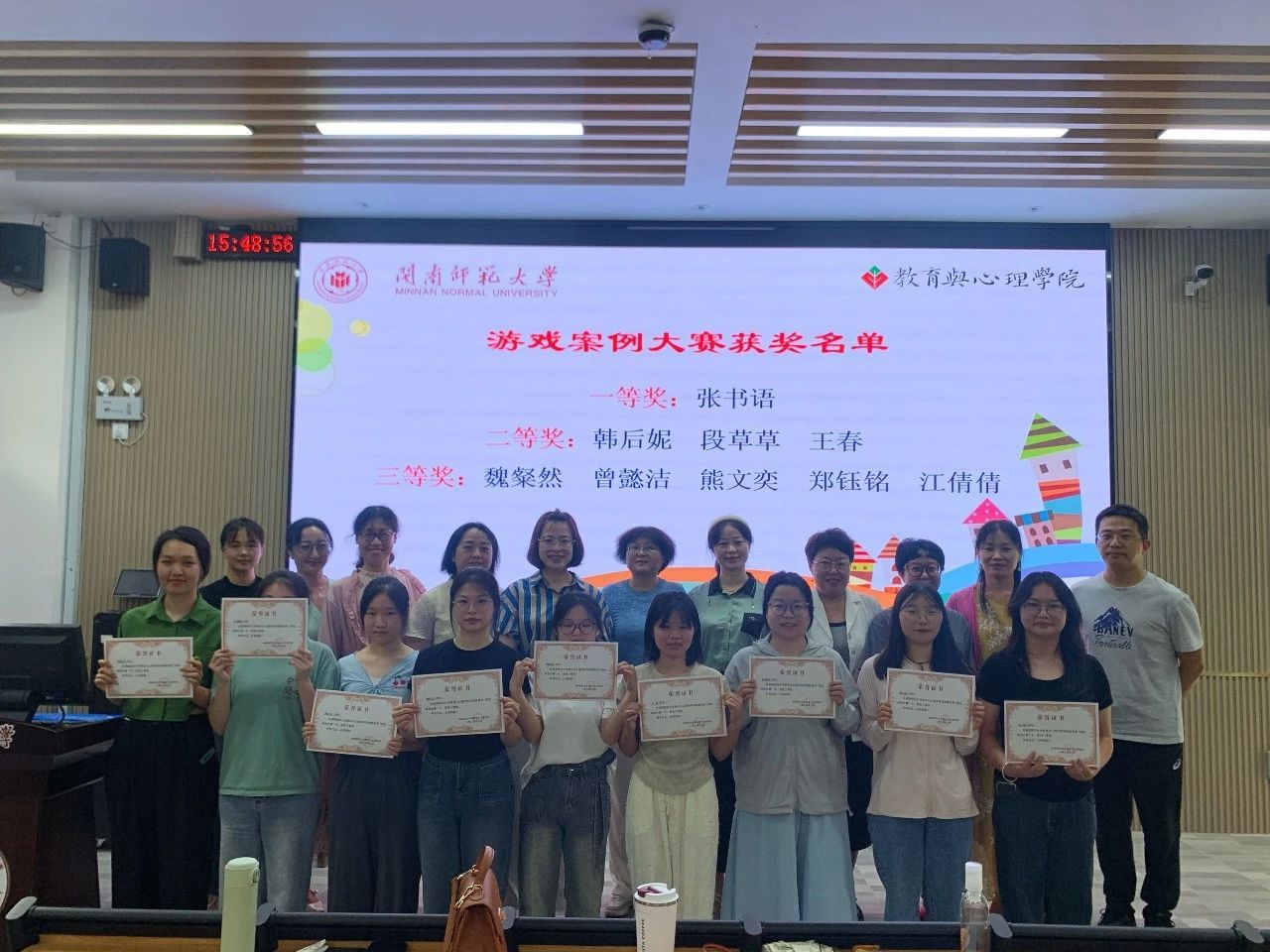 大会第三项议程是游戏案例大赛颁奖和优秀游戏案例分享环节。为了让同学们更好地认识游戏在学前教育中的重要意义,理解幼儿游戏的教育作用,在实习实践过程中深刻感悟《幼儿园教育指导纲要(试行)》中“幼儿园教育应以游戏为基本活动”的理念,学前教育系面对实习生们举办了“游戏案例大赛”,经全系教师评选,共评出一等奖一名、二等奖三名、三等奖五名。学前教育系主任杨爱君老师和全系教师为获奖同学颁发荣誉证书并合影留念。之后,大赛一等奖获得者张书语同学跟大家汇报分享了她精彩的游戏案例。