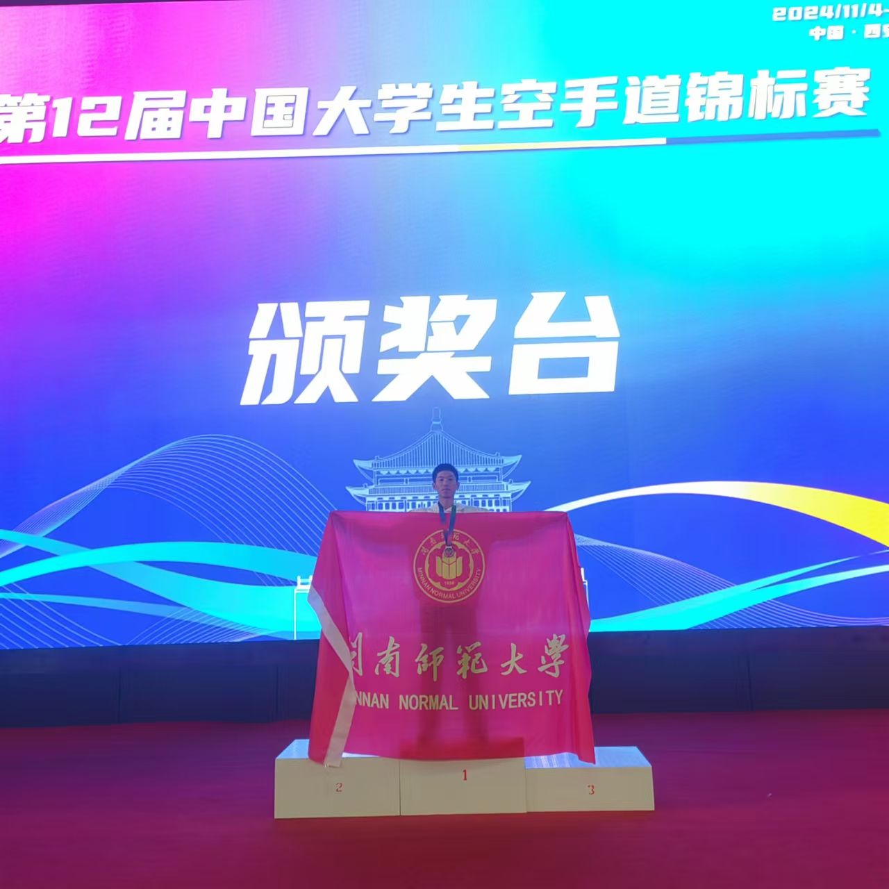 近日,由中国学生体育联合会主办的第12届中国大学生空手道锦标赛在西安外国语大学(长安校区)文体馆开幕。我院24级心理学专业邱全权同学在赛场上顽强拼搏,不畏强手,经过为期三天的激烈角逐,斩获男子组手组-58kg级别冠军。