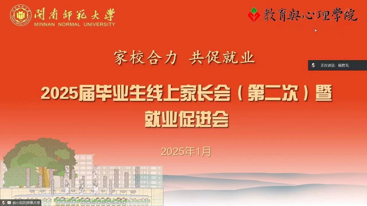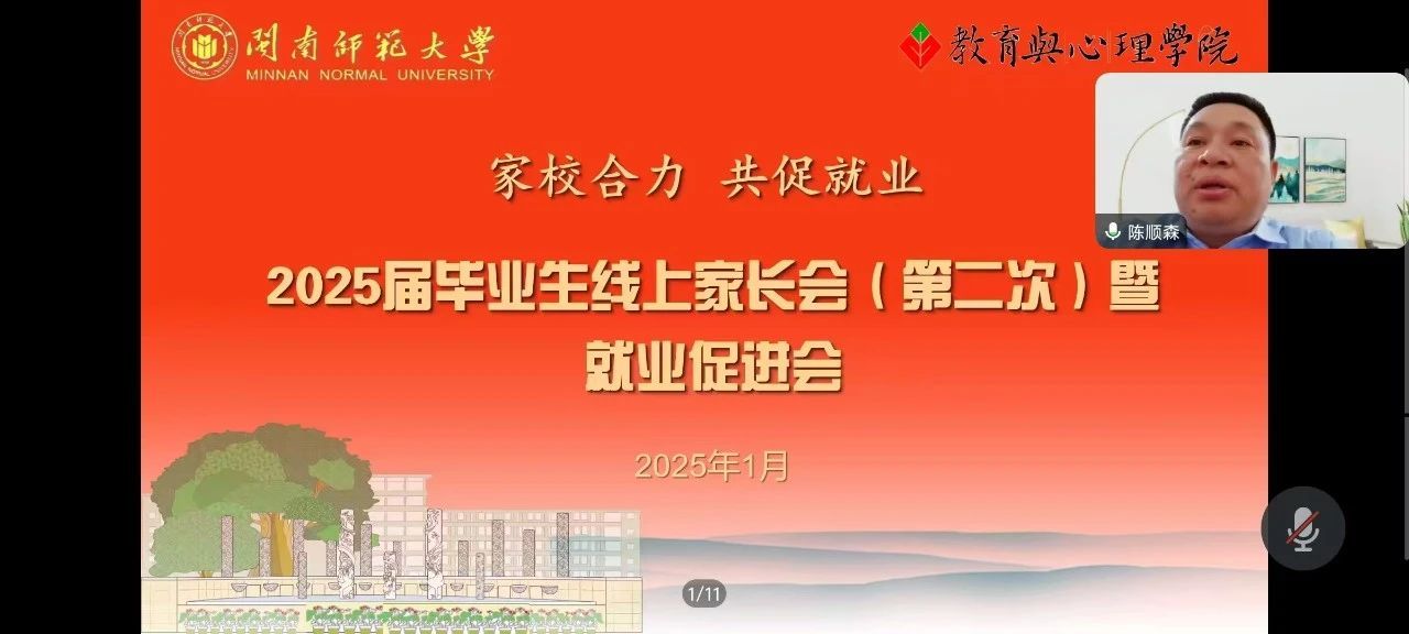 为进一步落实党中央、国务院、省委省政府、省教育厅和学校关于高校毕业生就业工作的决策部署,积极开展“寒假促就业暖心行动”,强化家校联动,帮助毕业生解决求职就业中的“急难愁盼”问题,1月24日晚,受院党委书记郑文海委托,我院于院办301第二次召开2025届毕业生线上家长会。院党委副书记、院长陈顺森,院党委副书记杨君玉,毕业班辅导员夏丽君、陈燕云、王文伟,2021届小学教育专业优秀校友谢佳祺、2025届全体毕业生及家长参加会议。