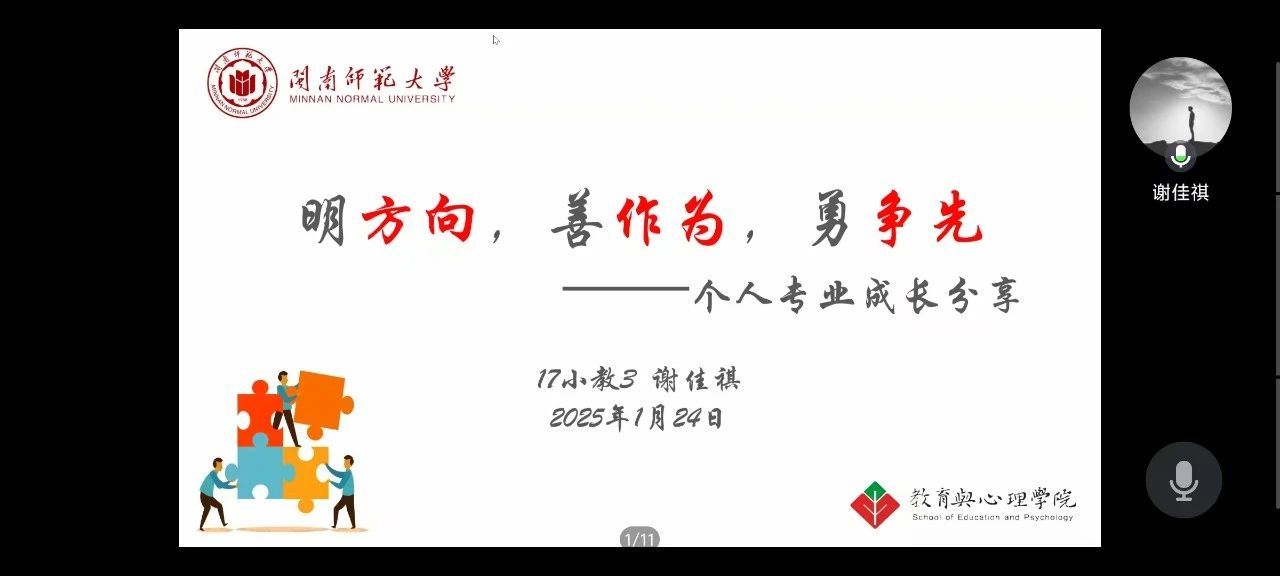 校友谢佳祺现为厦门市同安区洪塘中心小学二级教师,他分享了自己的片段教学设计,并从入职前的准备与入职后的职业发展等方面为毕业生们提供了职业规划指导。最后,他鼓励毕业生们积极就业,不放过每一个就业、深造的机会,留足选择空间,成就精彩人生。