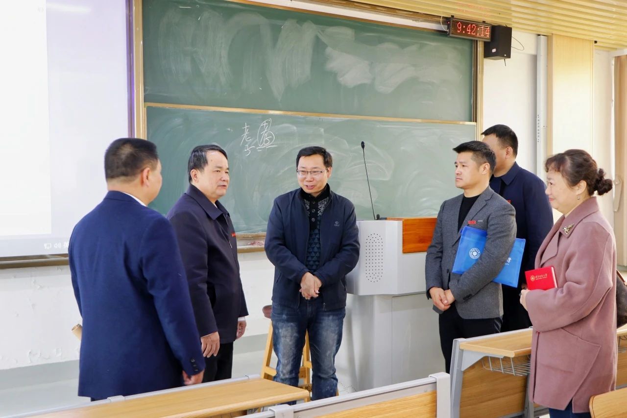 张校长认真记录课程要点,细致观察课堂教学互动情况。课后,张校长与刘立振老师进行了交流,对课堂组织、教学设计等方面给予肯定,并就进一步加强和改进思政课教学工作提出指导性意见。他指出,思政课是落实立德树人根本任务的关键课程,是学校对学生开展思想政治教育的主渠道、主阵地,高校教师要大力弘扬新时代教育家精神,提升教书育人能力,同时有效推进中华优秀传统文化融入思政课堂,强化文化铸魂育人功能,培养让党放心、爱国奉献、担当民族复兴重任的时代新人。