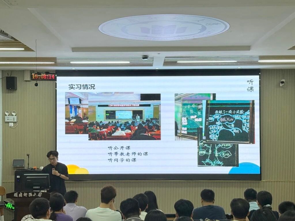 2022级的七支实习队代表依次上台作经验分享。队员们借助丰富的图片与视频资料,生动讲述了实习期间的趣事与挑战,真诚分享了在课堂教学、班级管理、师生互动等方面的成长与感悟。
