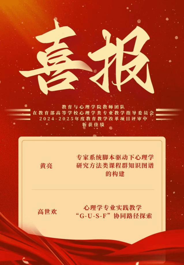 近日,教育部高等学校心理学类专业教学指导委员会公布了2024-2025年度教育教学改革项目的立项名单,我院黄亮老师的“专家系统脚本驱动下心理学研究方法类课程群知识图谱的构建”项目(课程建设类)和高世欢老师的“心理学专业实践教学‘G-U-S-F’协同路径探索”项目(实验实践教学类)获批立项!