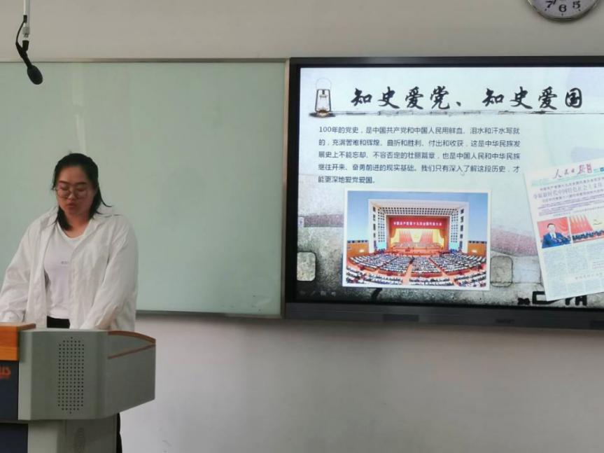 黄佳荧同学从党的历史脉络、党史三大启示、党的历史贡献、不忘初心四个部分让同学们明白学好党的历史的重大意义。了解过去才能把握今天,把握今天才能创造明天,感悟党史精神,脚踏实地,方能不负韶华。