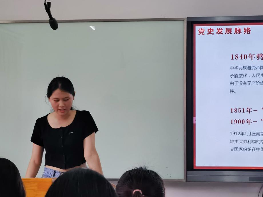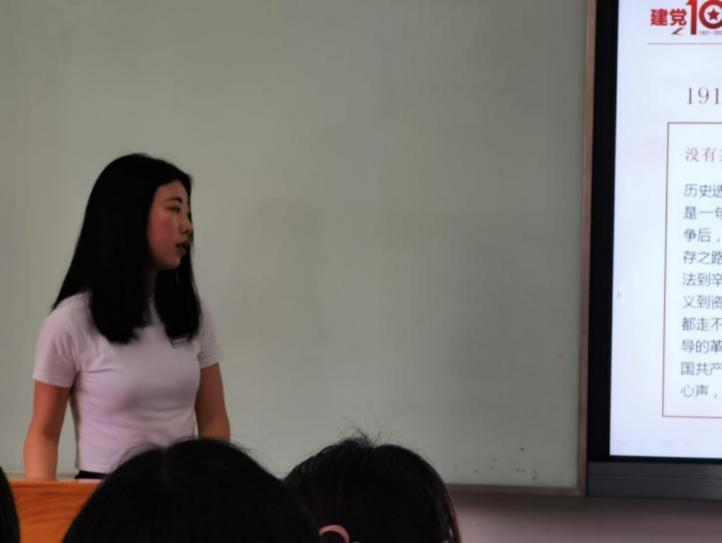 杨颖颖同学以“不忘初心,牢记使命”为主题,从中国共产党成立、党史的发展脉络、百年艰辛与辉煌和开创新的篇章四个方面介绍百年红色历史,并引用习近平总书记在党史学习教育动员大会上的讲话来帮助同学们更好地理解学习党史的重要意义。