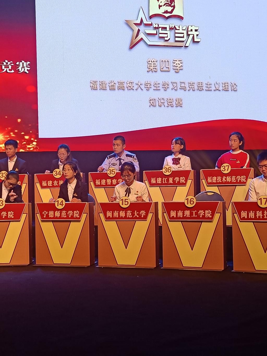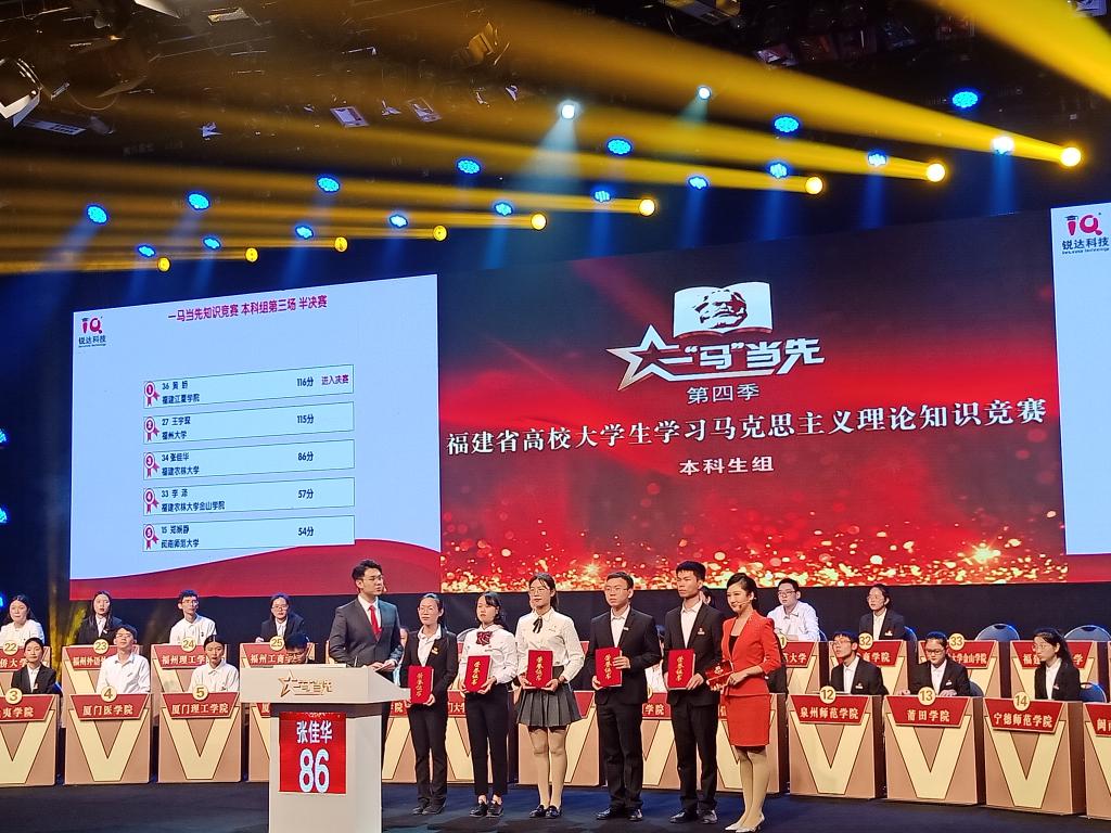 11月6日至11日,由中共福建省委教育工委主办,福建省高校思想政治理论课教学指导委员会、福建教育电视台承办的第四届福建省高校大学生学习马克思主义理论一“马”当先知识竞赛在福建师范大学举办。20万名参赛学生经过层层选拔淘汰,最终共有96支代表队相聚榕城,参加省级比赛。我院18级小教专业郑娴婧作为此次闽师大团队五名队员中唯一一位非思政专业成员,在本科组第三场晋级赛中以48分的优异成绩进入半决赛,经过激烈角逐,以54分的佳绩斩获半决赛第五名,在总决赛的赛场上,闽师大团队以525的高分获得了团体奖三等奖!