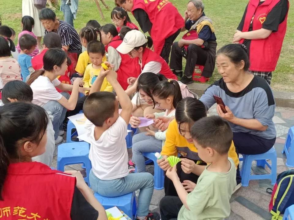 为庆祝建党100周年,积极响应党中央的号召,述往思来,向史而新,弘扬传承以爱国主义为核心的伟大精神,教育科学学院青年志愿者中心推出“菁苗小课堂”——“童心向党迎百年,红色经典永流传”志愿服务活动。自三月以来已开展五期,欢笑不断,精彩不停。第一期中志愿者身穿童趣表演服演绎经典绘本《贪吃的小河马》,孩子们在欢笑中学会分享。第二期活动中,志愿者演绎的《彩虹色的花》绘本故事,让孩子们感受到爱与奉献的力量。手工课堂的折叠中,饱含对红色文化的崇敬。在志愿者对《黄继光》《董存瑞》绘本故事的朗读中,英雄梦传递到了孩子们的心中。一件件精巧的手工在孩子们的手中诞生,喜悦悄悄爬上了他们的脸庞。第五期以手谣《中国小孩》开场,孩子们指尖跳动传递着身为“龙的传人”的自豪。