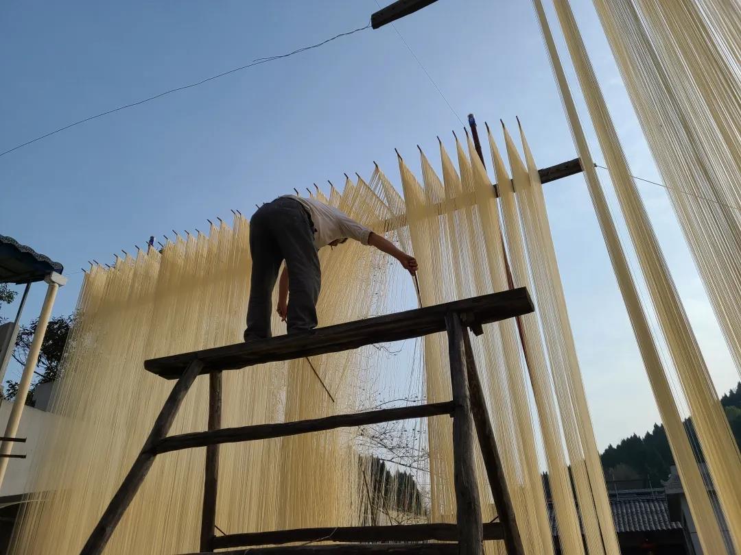 在中江县觉慧村,这座仅有40多户人口的小村庄,家家户户均以制挂面为生,故而人们亲切称它为挂面村。在这里,制作手工挂面的技艺传承了千年。小雪过后家家户户房前屋顶就会挂出一条条洁白如雪的面条,从不足一米的面条被拉到五米长,而后被自然风干,就连空气中也弥漫着面条的甜香味。
