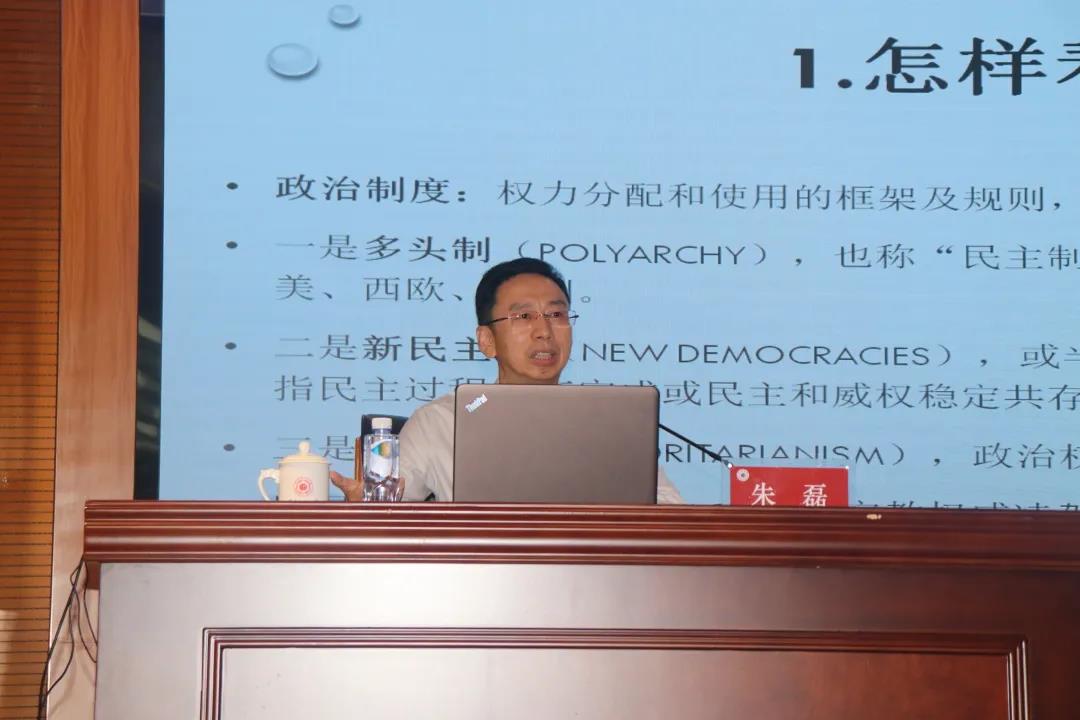 朱磊教授从“关于台湾问题的几个认识”、“实力格局变化带来的影响”、“解决台湾问题的方案选择”等三方面,深入剖析了国家统一规律与台湾问题本质。他没有对台湾问题做泛泛的现状介绍和政策解读,而是针对当前普遍对台湾问题的认识误区进行理论和逻辑层面的思辨。从台湾现行政治制度是否先进、台湾公民投票选举方式是否合理、台湾政党理念是否符合民意、两岸根本分歧是否可以和平解决、国家统一是否具有演化动力等层面,对台湾问题的本质与当前台海形势的判断进行了精辟阐述,深入浅出,举重若轻,别开生面,独树一帜,使师生们对纷繁复杂的台海局势有了新颖、系统、深刻的了解。