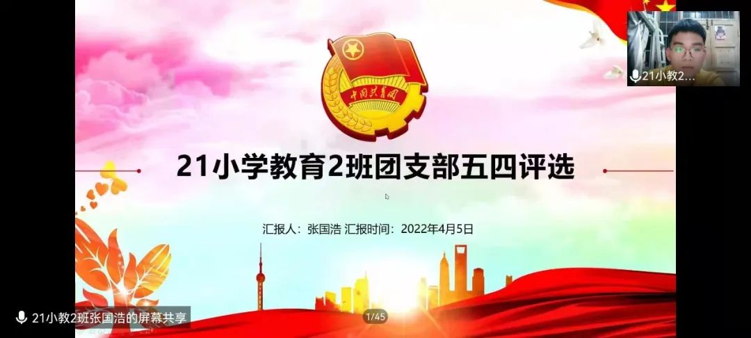 为了引导和激励广大团员青年传承弘扬“五四”精神,发扬先进典型的示范引领作用,集中展示我院各团支部和团员青年的良好精神风貌,以青春奋进之姿喜迎党的二十大顺利召开,教育科学学院于4月5日举办了以“喜迎二十大,奋进新征程”为主题的五四评选大会。鉴于当前疫情防控的形势与要求,本次五四评选大会采用线上形式,学院党委副书记杨君玉老师、团委书记夏丽君老师及各年级辅导员出席评选大会,共有25个团支部参加此次评选展示。