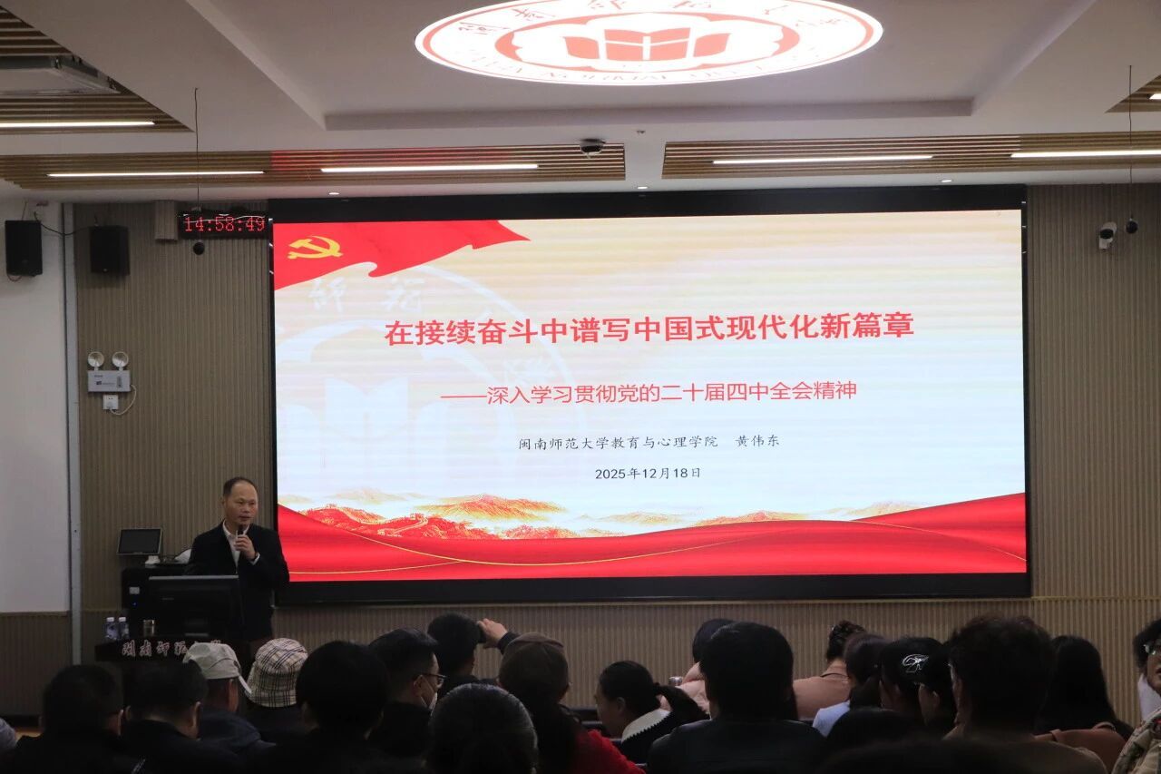 院党委书记黄伟东以《在接续奋斗中谱写中国式现代化新篇章》为题,系统阐述了党的二十届四中全会召开的时代背景与重大意义。他表示,全体教职工要坚持以党的全面领导为根本保证,深刻领会全会精神的核心要义与战略部署,自觉践行贯彻落实全会精神的政治责任与使命要求。要将学习贯彻全会精神与落实立德树人根本任务紧密结合,将其融入教育教学全过程、思想道德建设各环节,注重学生全面发展;要与推动学院高质量发展深度融合,统筹学科建设、课程改革与人才培养,深耕“三全育人”工程,守正创新,赋能育人质量持续提升。积极营造健康向上、理性平和的育人生态。他要求全院教职工切实把思想和行动统一到全会精神上来,坚守为党育人、为国育才的初心使命,在建设教育强国新征程中展现新担当、实现新作为、作出新贡献。