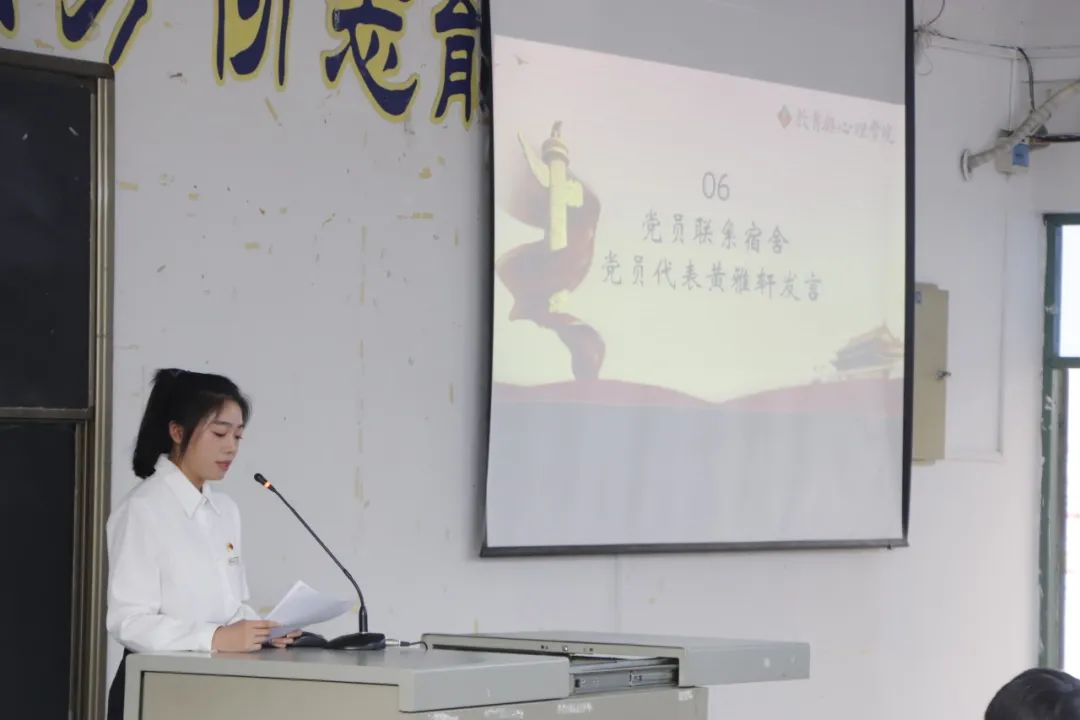 2021级小学教育专业黄雅轩作为党员联系宿舍的党员代表发言。她代表全体学生党员郑重承诺,将充分发挥党员的先锋模范作用,从学习、生活、工作、入党等方面与新生开展积极交流,为新生“办实事、解难题”。2023级小学教育专业陈逸辉作为宿舍长代表发言。他表示会虚心学习党员学长学姐身上的优秀品质,从生活,学习,工作等各方面积极进取,奋发向上,努力做一名社会主义合格建设者和可靠接班人。