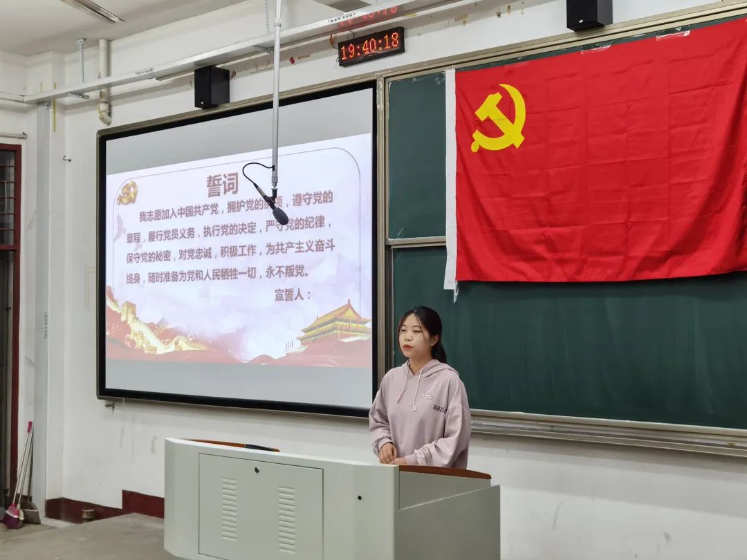 2018级预备党员代表罗晓玉同志分享了她加入中国共产党的心路历程,并鼓励党员同志和青年团员们要坚定理想信念,勇攀真理高峰,感悟思想伟力,同时扎根人民群众,践行知行合一,在接续奋斗中绽放绚丽的青春之花。