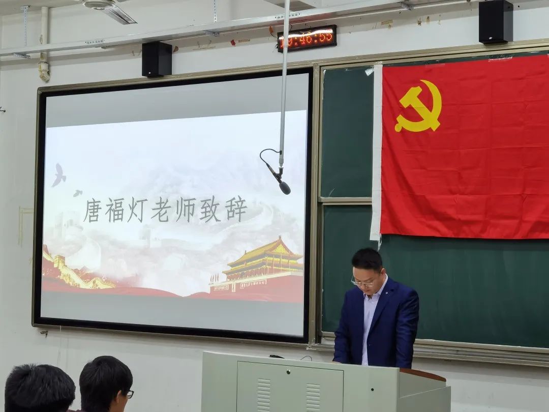 院党委组织员唐福灯老师为大会致辞,他对预备党员们提出两点要求:一是克己修身,严于律己;二是为党奉献,为民服务,为早日成为一名正式的、合格的中共党员而不懈奋斗。