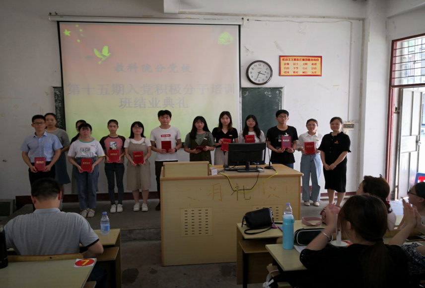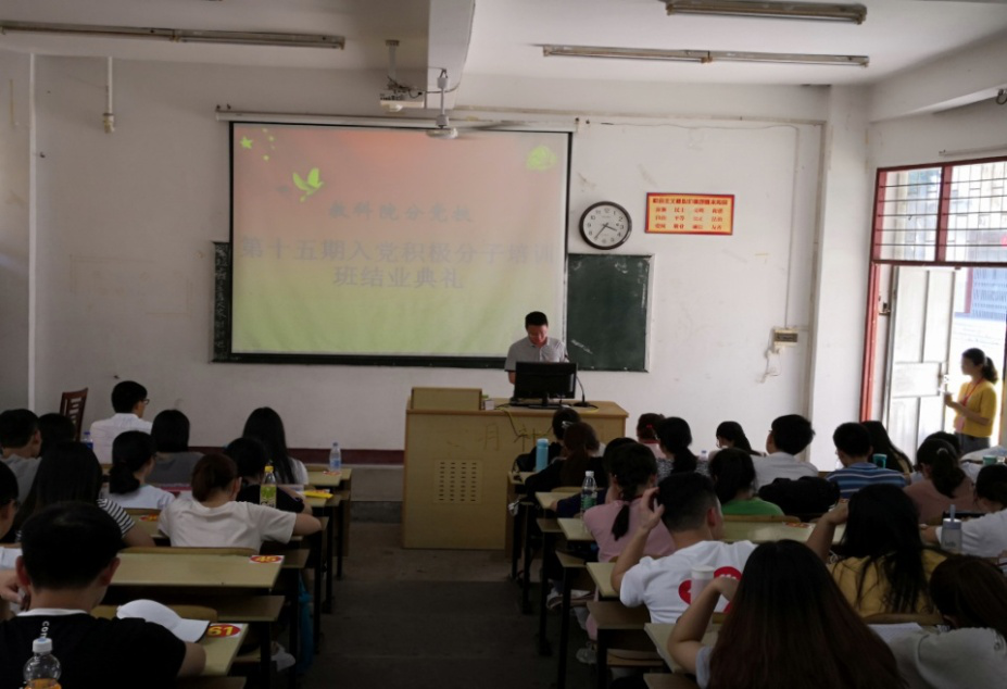 2019年4月25日下午,教育科学学院分党校第十五期入党积极分子培训班结业典礼于梯教一举行。院党委副书记杨君玉老师、院团委书记夏丽君老师、组织员唐福灯老师、研究生辅导员鲍超老师、18级辅导员陈钰煌老师、以及本期领队17级辅导员崔文菊老师出席了本次结业典礼。