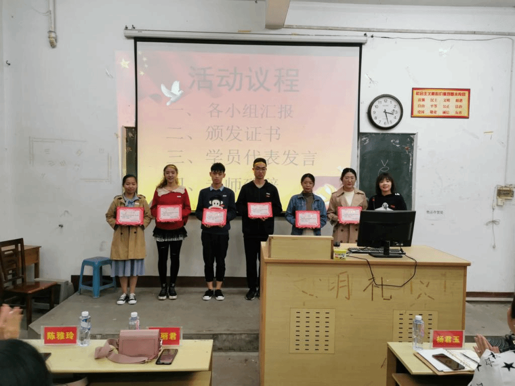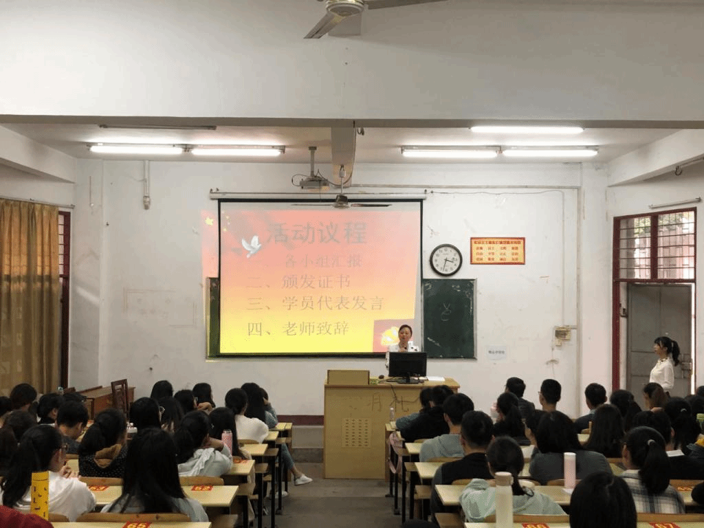 2019年11月28日下午,教育科学学院分党校第十六期入党积极分子培训班结业典礼于梯教一举行。院党委副书记杨君玉老师、院团委书记夏丽君老师、党委组织员唐福灯老师、18级辅导员陈钰煌老师以及19级辅导员陈雅玲老师出席了本次结业典礼。