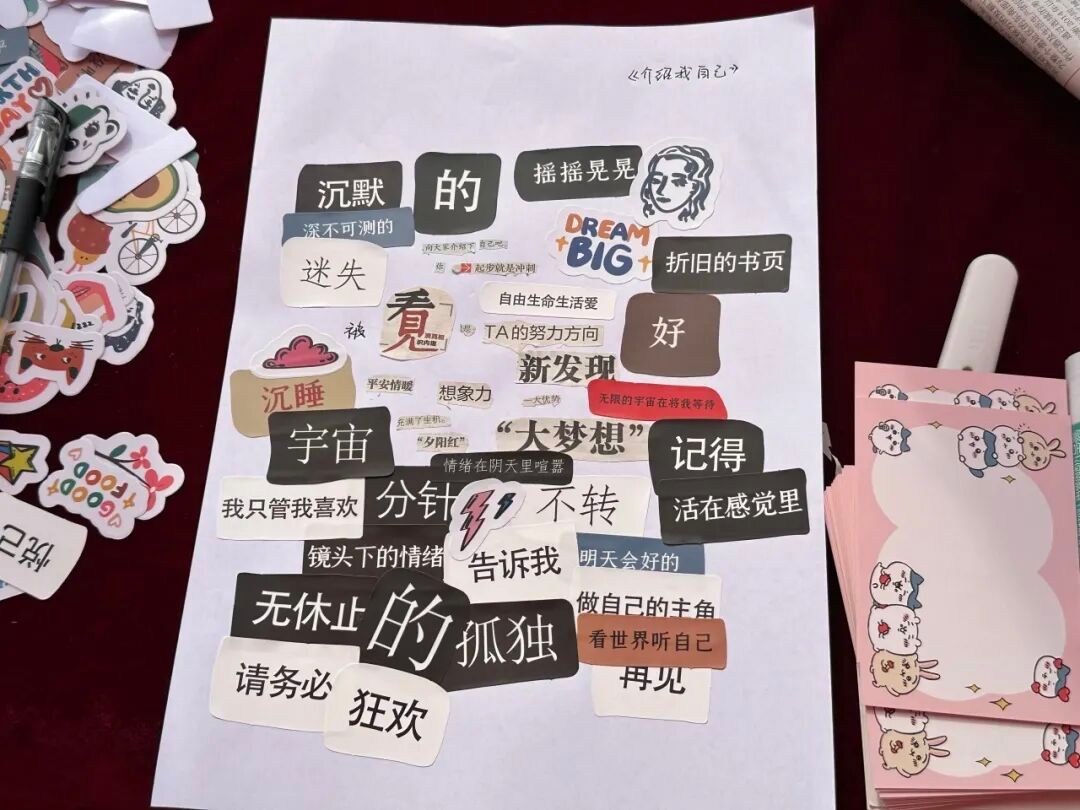 参与者从废弃报刊中裁剪文字,创作拼贴诗,将自身职业愿景与未来憧憬融入诗歌,以个性词句表达内心情绪,增强自我认知。