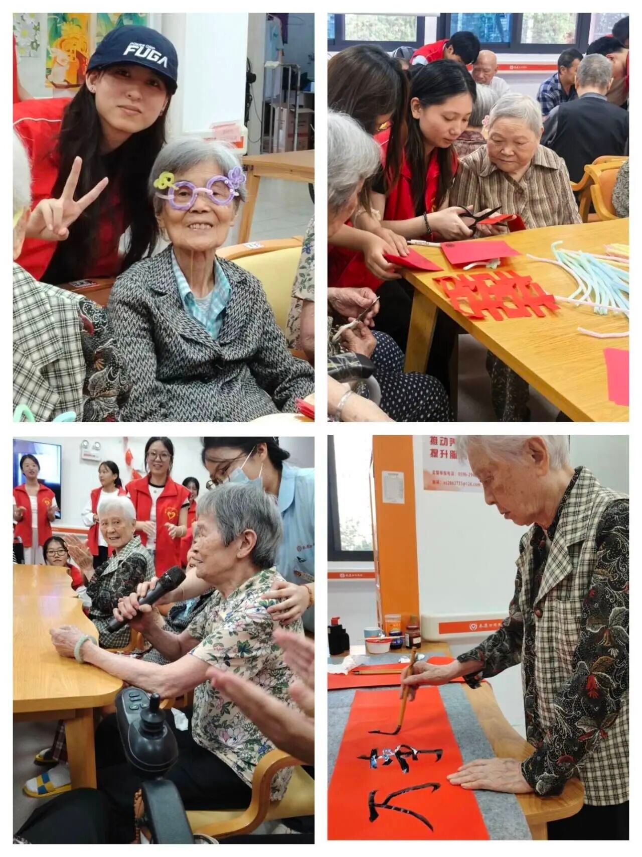 在志愿者的耐心陪伴下,老人们兴致盎然,巧手不停。扭扭棒桌前,一朵朵别致生动的花在指尖绽放;剪纸区域,长辈们在一折一剪中领略非遗韵味,创作出“囍”字等吉祥纹样;墨香氤氲处,大家共同执笔书写,一幅幅寓意美好的“福”“寿”作品依次呈现。活动现场洋溢着温馨与热烈的气氛。