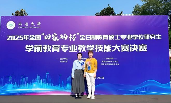 近日,2025年全国“田家炳杯”全日制教育硕士专业学位研究生学前教育、特殊教育专业教学技能大赛决赛分别在南通大学、重庆师范大学举办。我院由刘黎微副教授指导的2024级学前教育专业硕士研究生陈珊妮喜获三等奖、由林国耀副教授指导的2024级特殊教育专业硕士研究生吕洋喜获优秀教学设计奖。